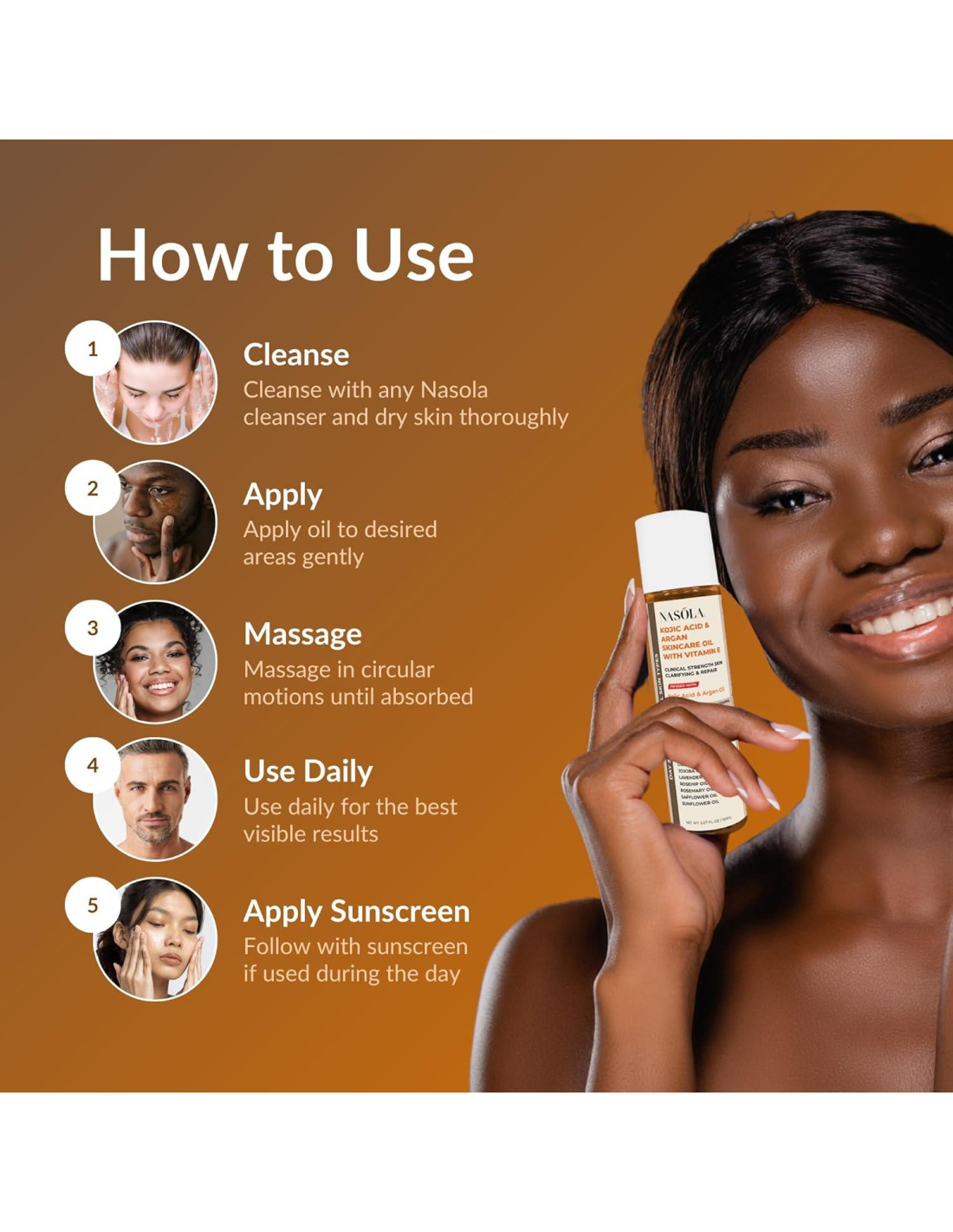 - Claridad del Ácido Kójico: Infundido con Ácido Kójico, este aceite bio de cuidado de la piel ayuda a aclarar y perfeccionar la piel, apuntando a la apariencia de imperfecciones, manchas oscuras inducidas por el ambiente y cicatrices de acné, promoviendo un cutis tonificado y radiante.