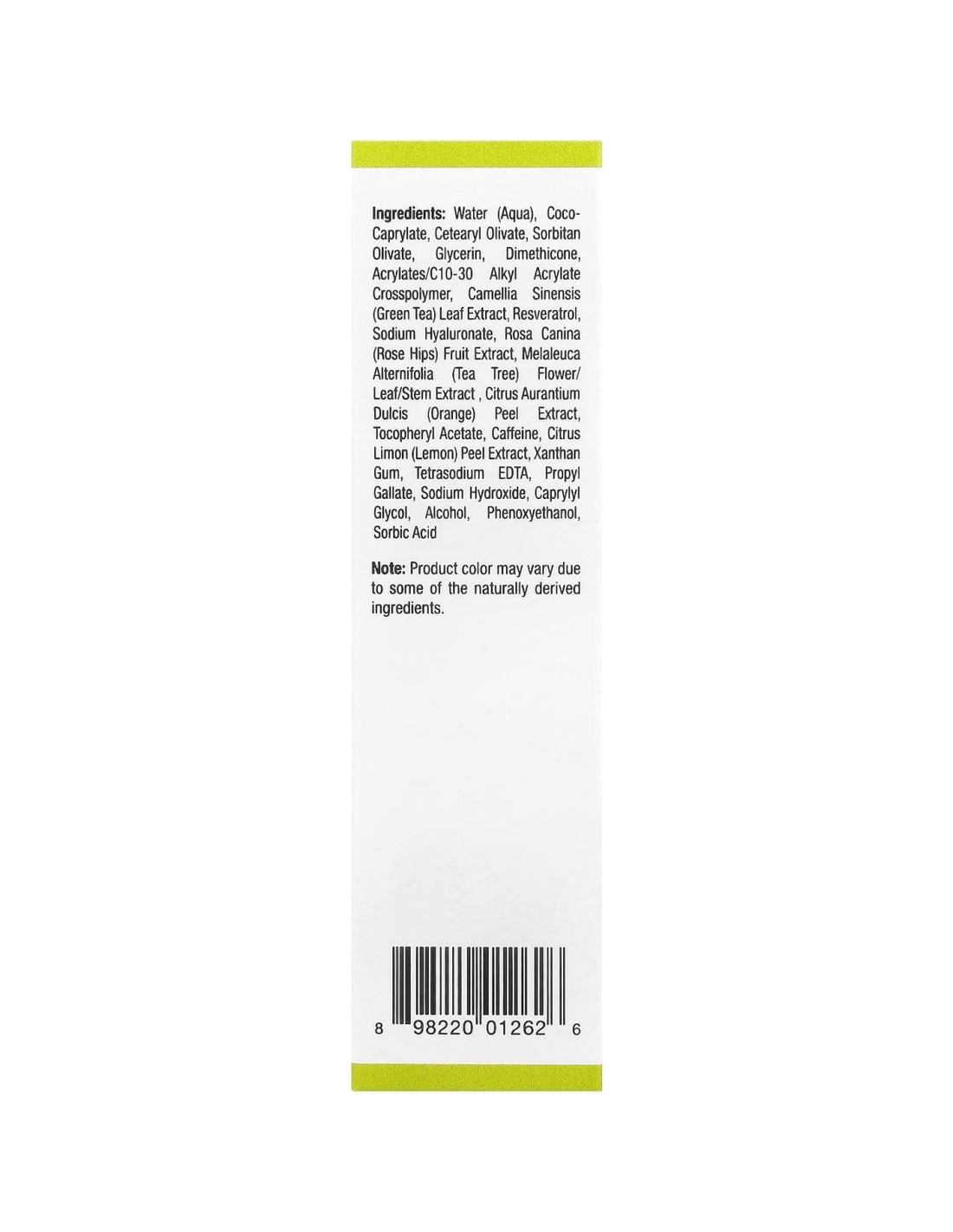 Agua (Aqua), Coco-Caprilato, Olivato de Cetearyl, Olivato de Sorbitán, Glicerina, Dimeticona, Acrilatos/C10-30 Acrilato de Alquilo Crosspolymer, Extracto de Hoja de Camellia Sinensis (Té Verde), Resveratrol, Sodium Hyaluronate, Extracto de Fruto de Rosa Canina (Caderas de Rosa), Extracto de Flor/Hoja/Tallo de Melaleuca Alternifolia (Árbol de Té), Extracto de Cáscara de Citrus Aurantium Dulcis (Naranja), Acetato de Tocoferilo, Cafeína, Extracto de Cáscara de Citrus Limon (Limón), Goma Xantana, Tetrasodio EDTA, Galato de Propilo, Hidróxido de Sodio, Glicol Caprílico, Alcohol, Fenoxietanol, Ácido Sórbico.