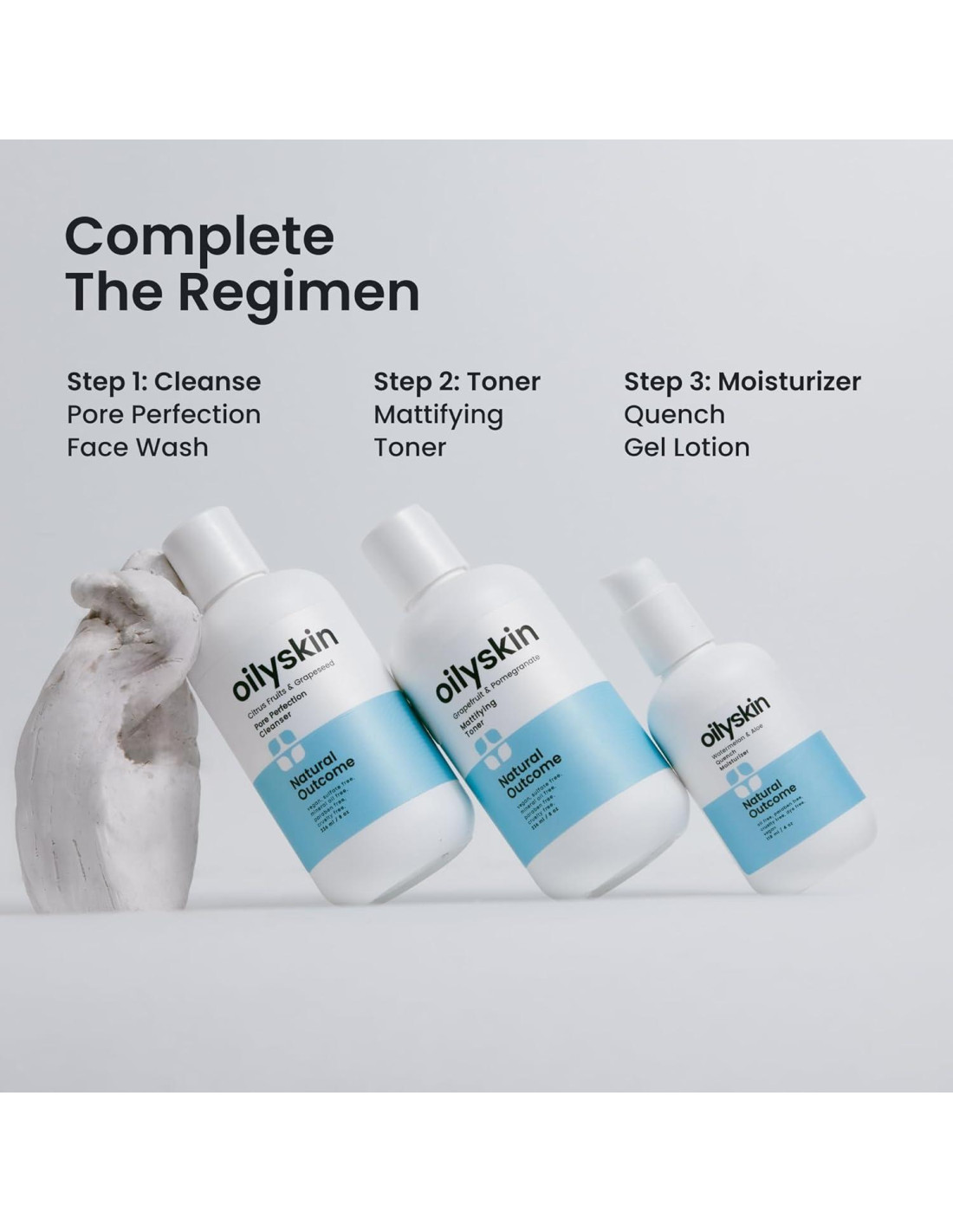 Nuestro régimen de control de aceite de 3 pasos diseñado para equilibrar la piel sin despojarla ni secarla! Gel Limpiador Diario con frutas cítricas aclaradoras y aceite de semilla de uva equilibrante. Tónico Astringente con Hamamelis, Pomelo y Granada. Loción Hidratante en Gel Sin Aceite con sandía, aloe y ácido hialurónico. Equilibrio sin Despojar. Nuestro régimen equilibra los tipos de piel grasa y nunca seca en exceso la piel para un control óptimo del sebo.