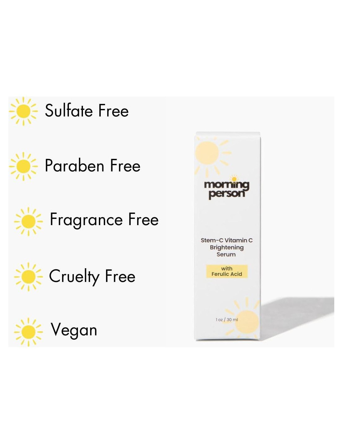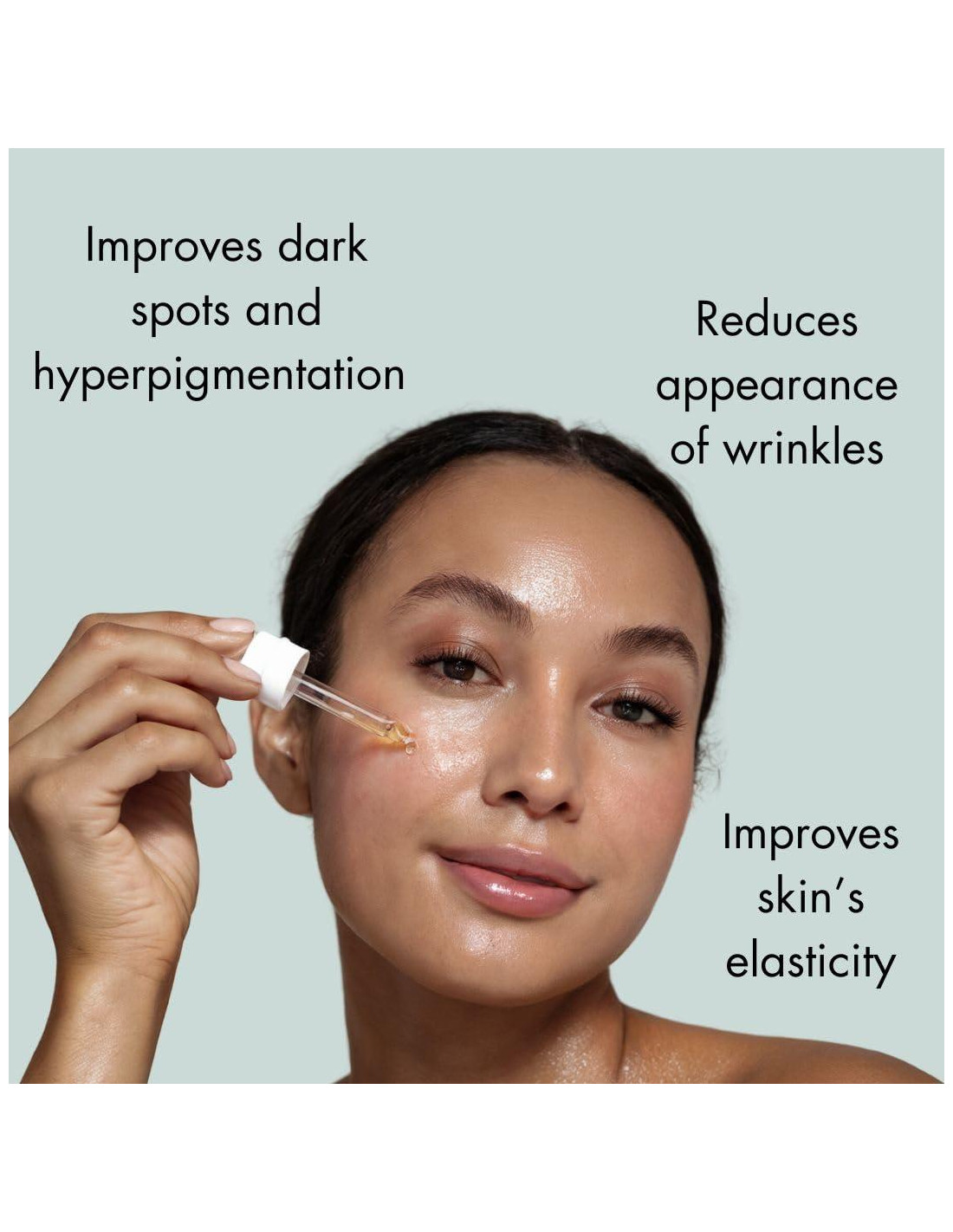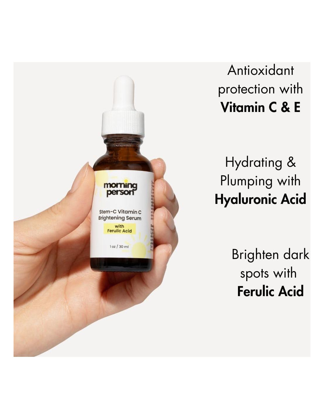 Proveniente de células madre de naranja, restaura la elasticidad de la piel, reduce la apariencia de arrugas y ofrece un cutis más suave y sedoso. Conocido por su capacidad para reducir la apariencia de manchas oscuras, hiperpigmentación y tono de piel desigual. Funciona inhibiendo la producción de melanina, el pigmento responsable de las manchas oscuras y la decoloración. Con el tiempo, el uso regular puede ayudar a darle a la piel una apariencia más radiante y uniforme. Este hidratante natural retiene la humedad, dejando la piel rellena, suave y bien hidratada. Calma y proporciona protección antioxidante adicional. Alisa el tono de la piel y ofrece un cutis más suave y sedoso. La Vitamina C, nuestro ingrediente estrella, ayuda a iluminar los cutis, reducir la apariencia de manchas oscuras y promover un tono de piel saludable y radiante.