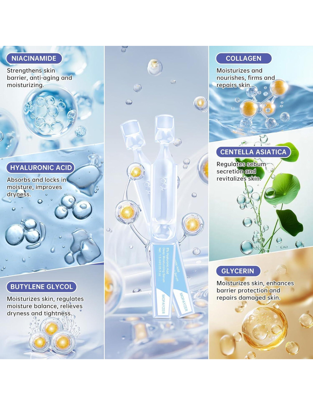 - Suave para Todos los Tipos de Piel: Vial de suero de ácido hialurónico enriquecido con una variedad de ingredientes suaves 5% ácido hialurónico, colágeno, niacinamida y extractos de centella asiática. Textura ligera y no grasa, adecuada para todos los tipos de piel, incluyendo piel sensible