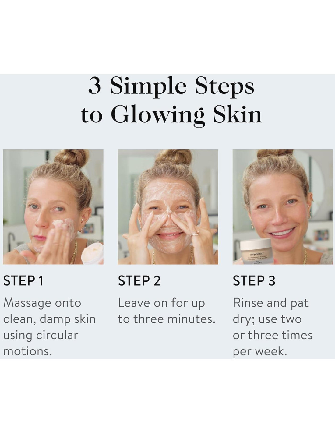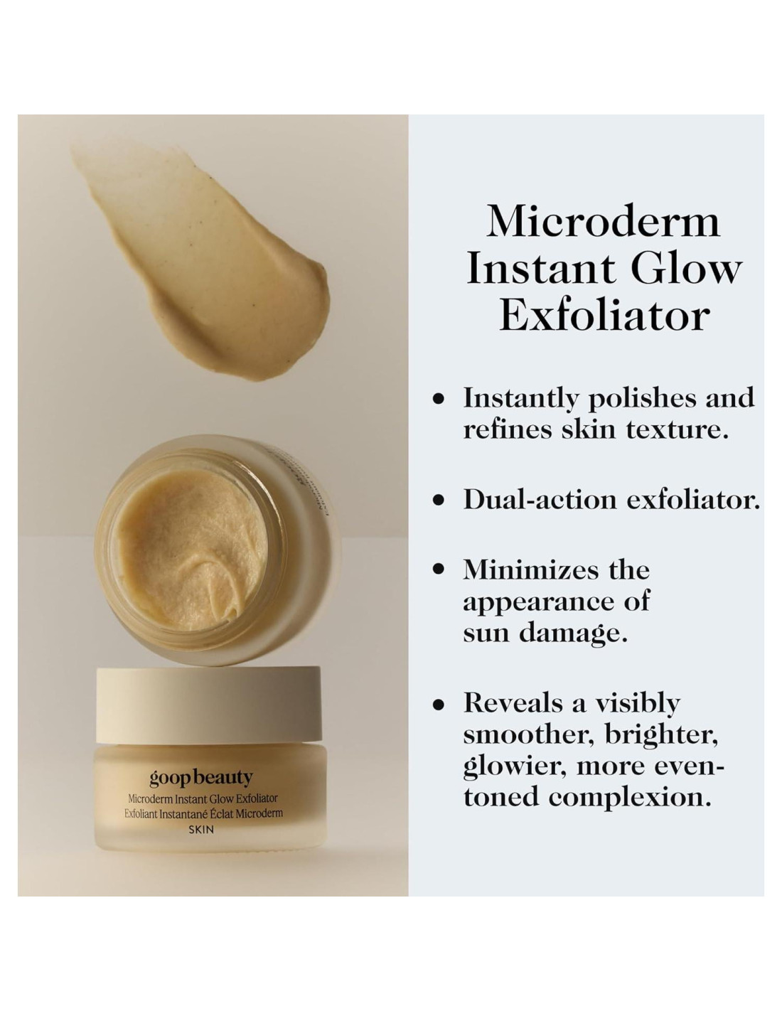 - Textura Similar a Malvavisco: Este exfoliante tiene una fórmula aireada, casi similar a un malvavisco, densamente empaquetada con una mezcla de cuatro poderosos minerales microexfoliantes que inducen el brillo.