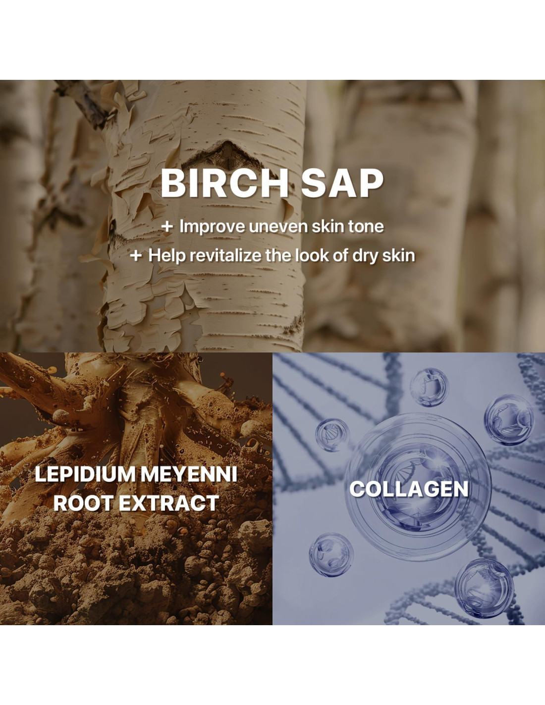 - [Ingredientes Clave] SAVIA DE ABEDUL: Alivia la sequedad, fortalece el nivel de hidratación de la piel y la barrera de humedad. EXTRACTO DE RAÍZ DE LEPIDIUM MEYENNI: Mejora el tono de piel desigual y ayuda a revitalizar la apariencia de la piel seca. COLÁGENO: Mejora la suavidad. Repara y fortalece la barrera de humedad.