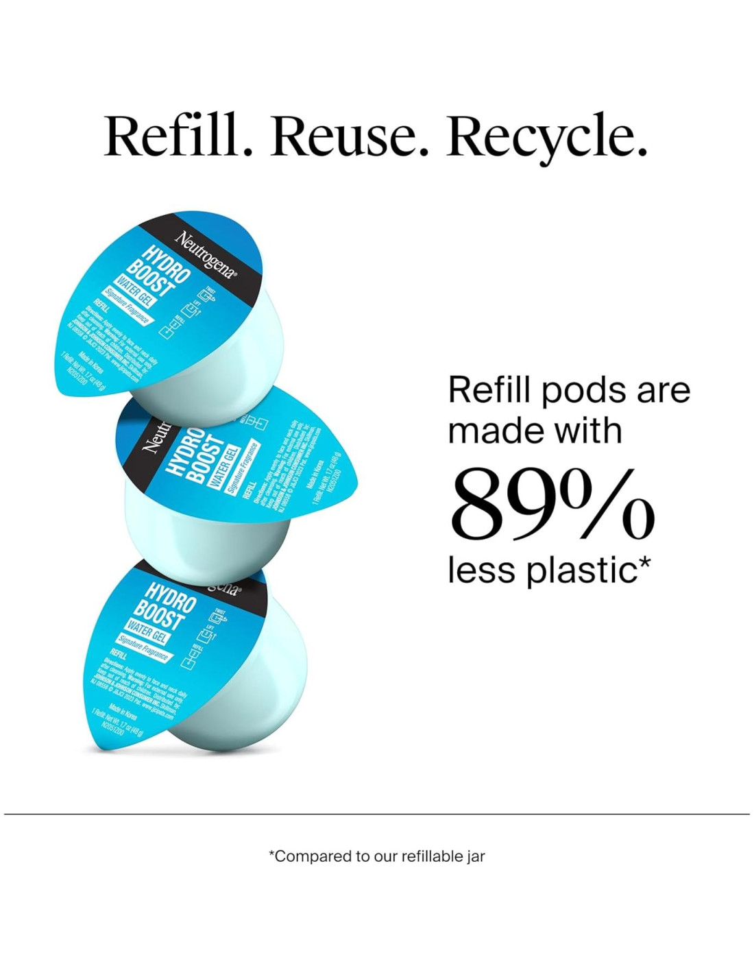 - Pod de recarga de 48.19 g de Neutrogena Hydro Boost Gel Hidratante Facial que ofrece un estallido refrescante de hidratación para una piel radiante. Usa este pod hecho con un 89% menos de plástico para recargar tu tarro de vidrio reciclable Hydro Boost.