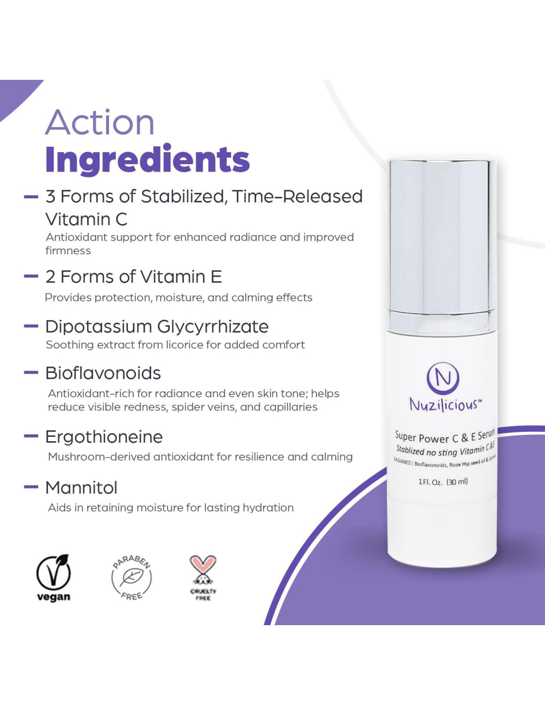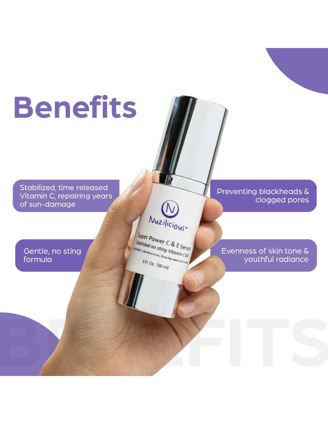 - Por qué es genial: Un verdadero multiusos. Solo una gota de nuestro suero facial de vitamina C proporciona una mezcla potente de ingredientes que nutren la piel. Con tres formas específicas de vitamina C, ofrece resultados máximos a concentraciones más bajas, reduciendo el riesgo de irritación u oxidación. El sistema de entrega avanzado en Super C y E asegura el equivalente al 14% de vitamina C libre, aumentando su efectividad sin comprometer la salud de tu piel.