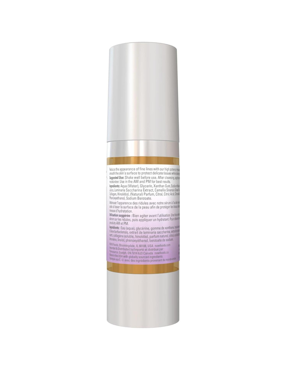 Descripción del Producto Condición: Para todo tipo de piel. Piel que desarrolla líneas finas alrededor de los ojos, frente y boca, con pérdida de textura juvenil. Solución: Suero de Ácido Hialurónico de alta potencia reduce naturalmente la apariencia de líneas finas y suaviza la superficie de la piel para proteger el tejido delicado. Agitar bien antes de usar. Después de limpiar y tonificar la piel, aplicar el suero en las áreas donde las líneas finas son visibles, luego aplicar una crema hidratante. Usar en la mañana y en la noche para obtener los mejores resultados. Este producto utiliza un dispensador sin aire para preservar la integridad del producto. Para facilitar su uso, agitar la botella y bombear varias veces para eliminar el exceso de aire. Este proceso puede necesitar ser repetido periódicamente. Ingredientes: Agua, Jugo de Hoja de Aloe Barbadensis*, Glicerina, Goma Xantana, Aroma Natural, Sodium Hyaluronate (Ácido Hialurónico), Extracto de Hoja de Camellia Sinensis (Té Verde), Extracto de Algas, Colágeno Soluble, Hinokitiol Natural. *Productos NOW Solutions certificados orgánicos no son probados en animales. Historia de la Marca Por NOW Foods