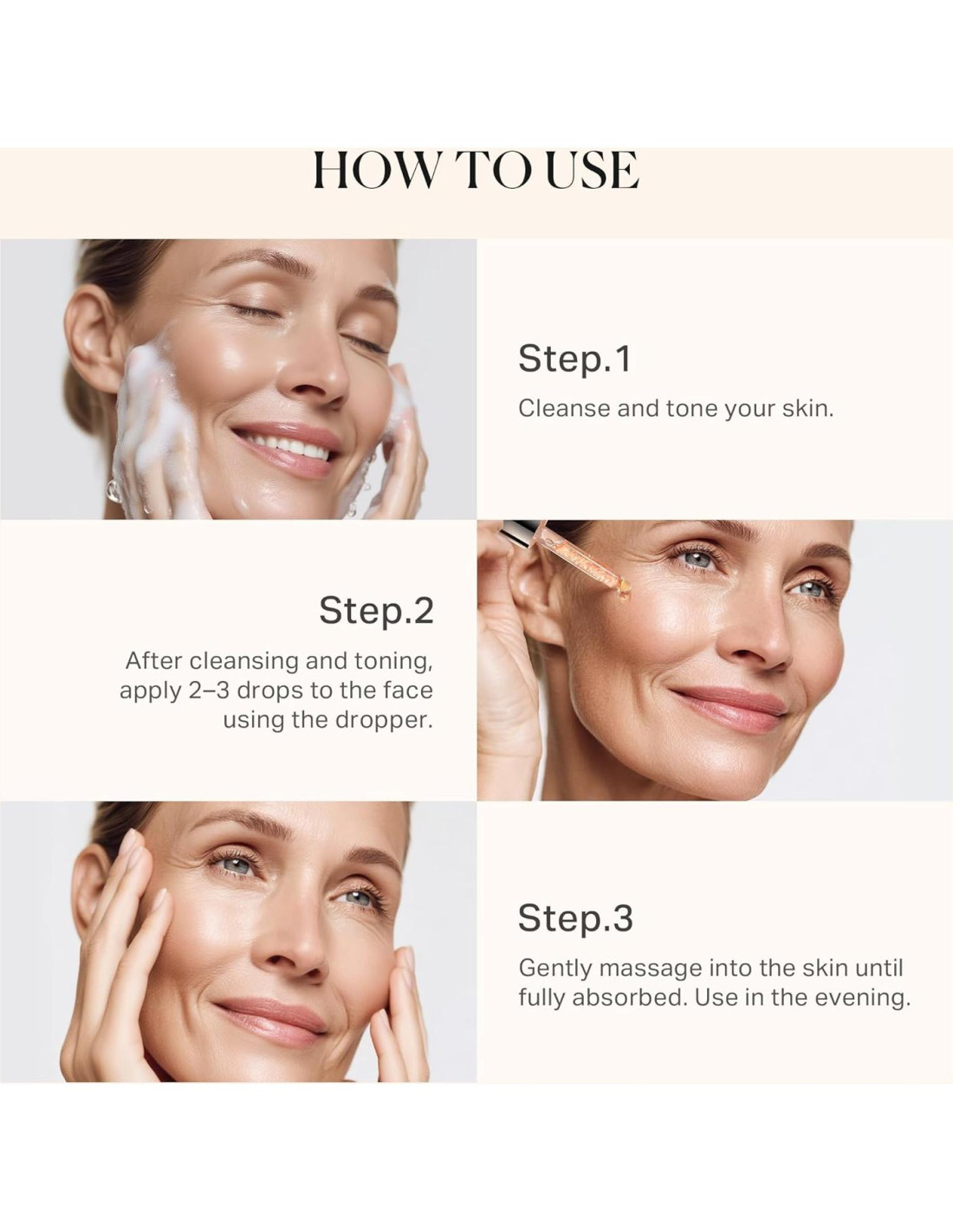- [ CÓMO USAR PARA MEJORES RESULTADOS ]: Aplica de 2 a 3 gotas sobre la piel limpia y tonificada por la noche. Masajea suavemente hasta que se absorba por completo. Comienza con 2 a 3 veces a la semana y aumenta a uso diario si se tolera. Ideal para piel que ha perdido su brillo debido a la sequedad y los primeros signos de envejecimiento, como líneas finas, textura desigual, manchas de edad y opacidad