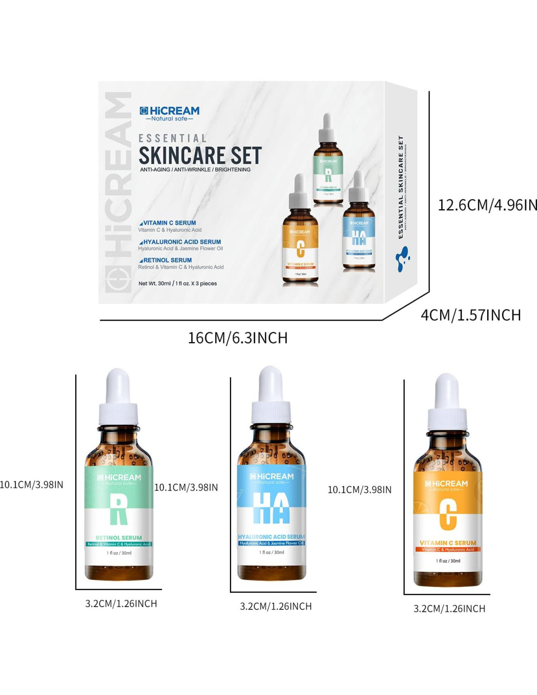 - Kit de Cuidado de la Piel de Efecto Triple Avanzado: Este conjunto incluye Suero de Vitamina C, Suero de Ácido Hialurónico y Suero de Retinol. Trabajan juntos para proporcionar hidratación profunda, iluminar la piel y mejorar la luminosidad y elasticidad. Adecuado tanto para mujeres como para hombres, esta poderosa colección de cuidado de la piel de triple acción ayuda a revelar un tú más joven y vibrante.