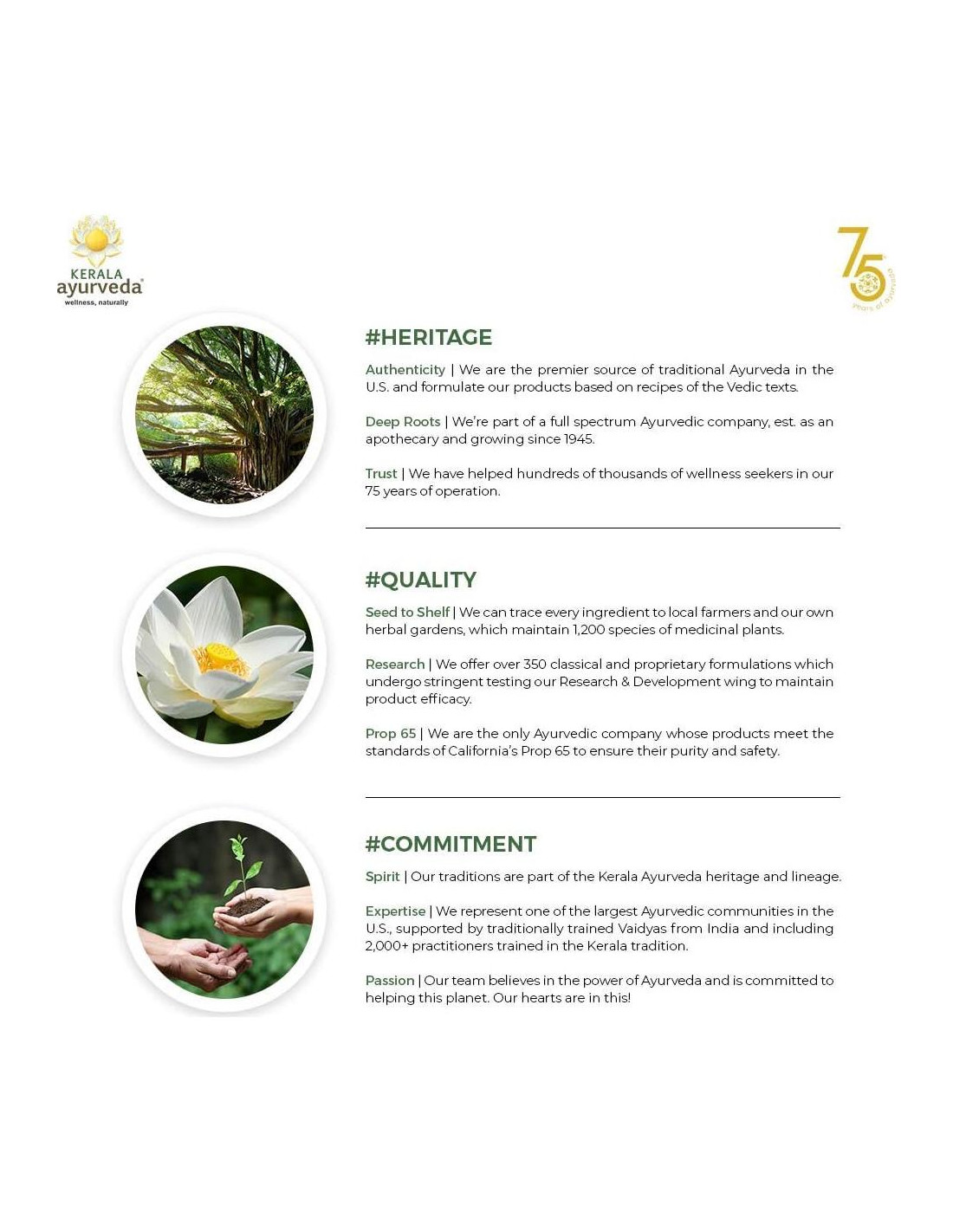 - HERENCIA DE KERALA AYURVEDA: Con un rico legado que abarca más de 80 años, somos pioneros en Ayurveda Auténtico y expertos en sanación holística. Nuestros productos son naturales y herbales. Son una mezcla perfecta de clásico con un toque moderno para complementar su estilo de vida activo.