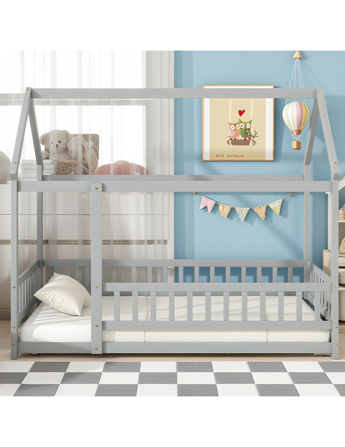 Estructura de Cama en el Suelo Twin Bellemave Casa para Niños con Marco de Techo Bonito, Cama en el Suelo Montessori de Madera Resistente Tamaño Twin Casa de Juego Segura con Barandillas, Carga 113.4 KG, Gris
