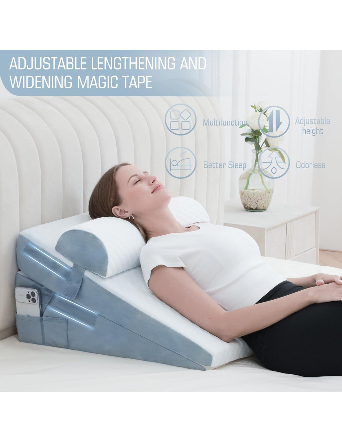 - DISEÑO AJUSTABLE EN ALTURA: Nuestro cojín en cuña de espuma viscoelástica consiste en tres partes, un reposacabezas en media luna, un cojín inferior de 7.5 pulgadas (19.05 cm) y un cojín superior de 4.5 pulgadas (11.43 cm), con 2 piezas de cinta mágica extendida cosidas en el lado del cojín, puedes cambiar la altura a voluntad (4.5 pulgadas (11.43 cm), 7.5 pulgadas (19.05 cm), 12 pulgadas (30.48 cm)) para satisfacer tus necesidades diarias.