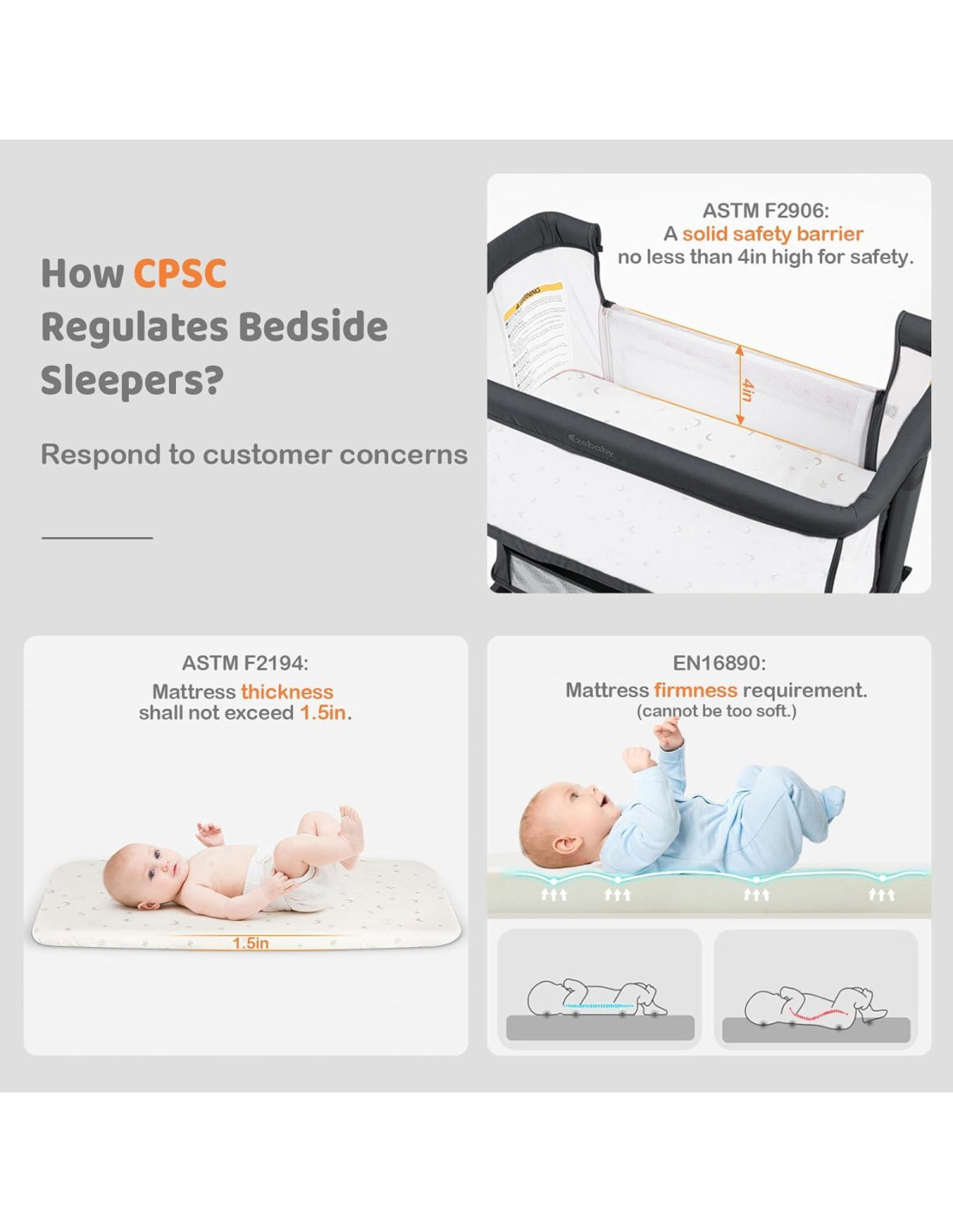 - Certificada Segura por CPSC y ASTM: La cuna lateral ha sido sometida a pruebas rigurosas por instituciones reconocidas para garantizar su seguridad y calidad. Ten en cuenta que el grosor máximo del colchón no debe exceder 1.5 pulgadas (3.8 cm), como lo recomienda la normativa ASTM para mitigar el riesgo de asfixia.
