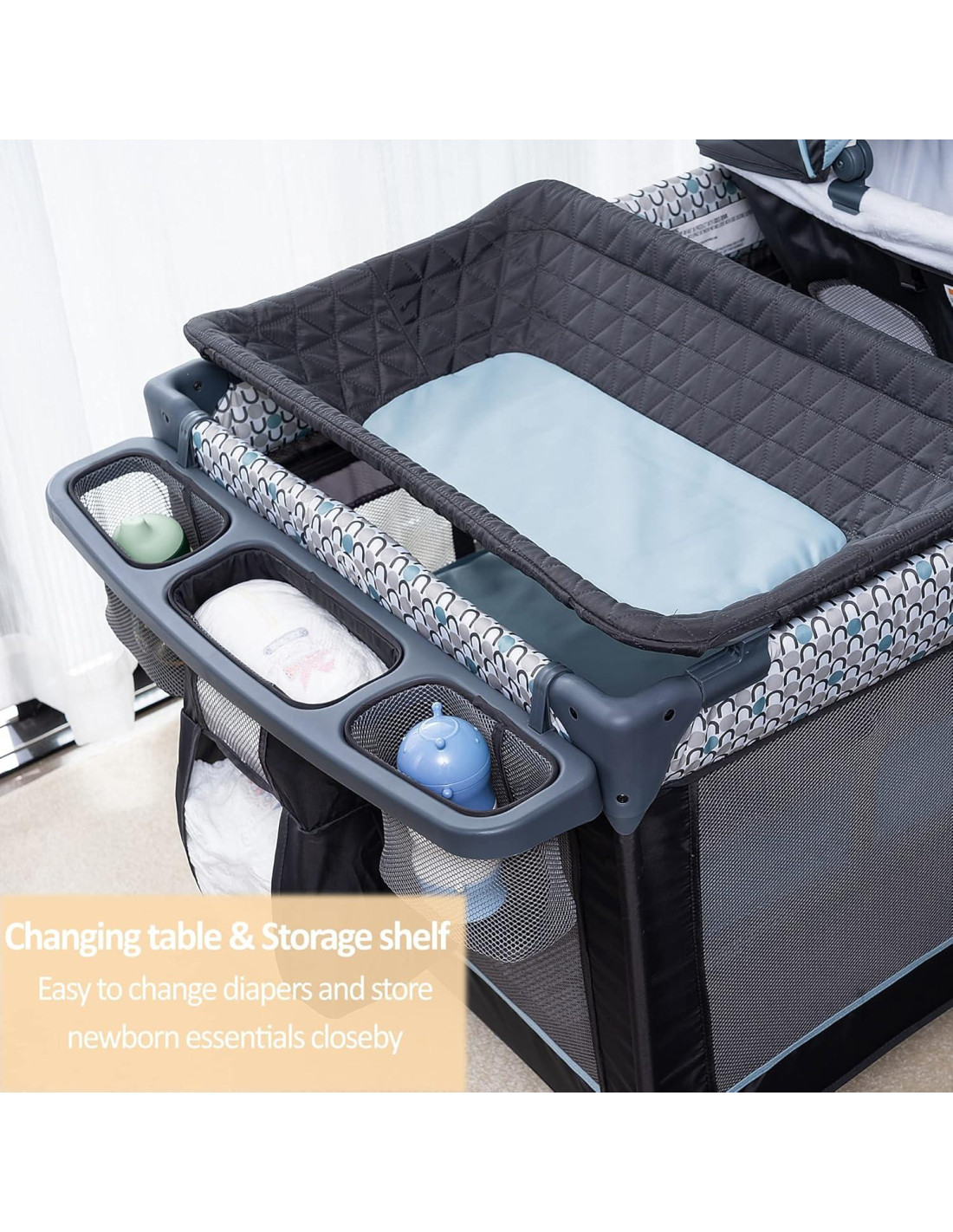 - DISEÑO TODO EN 1 - Incluye Esenciales para Recién Nacidos: Este Pack and Play 5 en 1 cuenta con un centro de guardería de lujo que no solo es un parque infantil, sino también una cuna portátil con colchón cómodo y napper para recién nacidos con dosel para bebés de 0 a 3 años (0-15 kg), satisfaciendo perfectamente muchas de tus necesidades y acompañando el crecimiento de tu bebé, 2 adorables juguetes colgantes suaves para captar la atención de tu bebé.