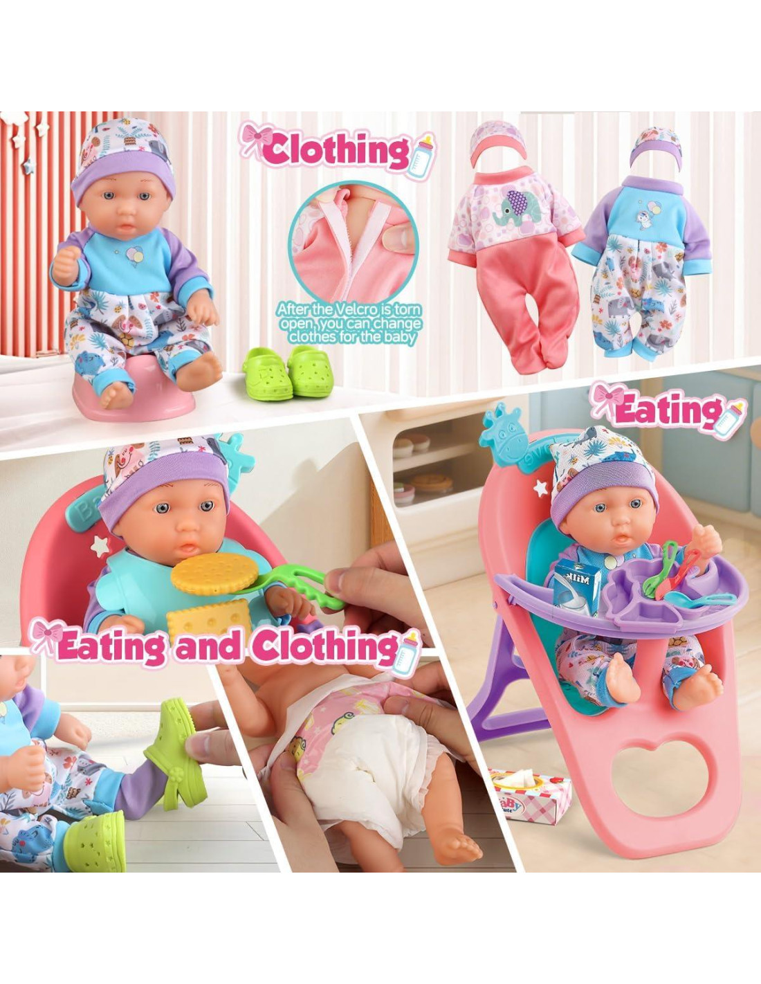- [Juego de Accesorios para Cuna de Muñeca] - Nuestro juego de accesorios para cuna de muñeca incluye cama para muñeca x1, muñeca de 11" (27.94 cm) x1, carrito de muñeca x1, silla alta para muñeca, almohada de edredón, 2 conjuntos de ropa para muñeca, y 24 PCS de accesorios para muñeca (incluyendo juguetes de muñeca de animales, inodoro, plato de comedor, etc.). Los ricos accesorios pueden proporcionar a los niños una experiencia de juego de roles realista y disfrutar de más diversión.