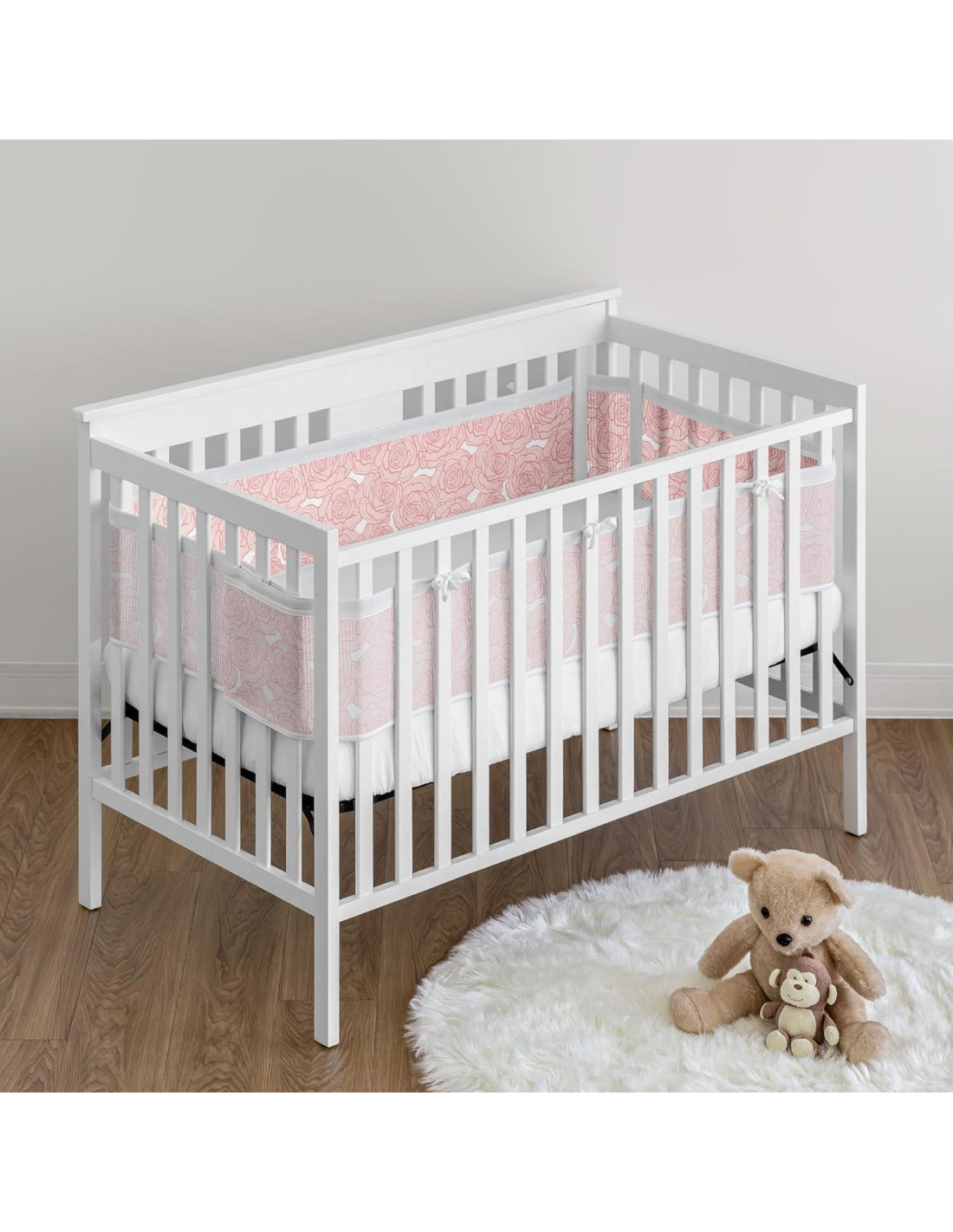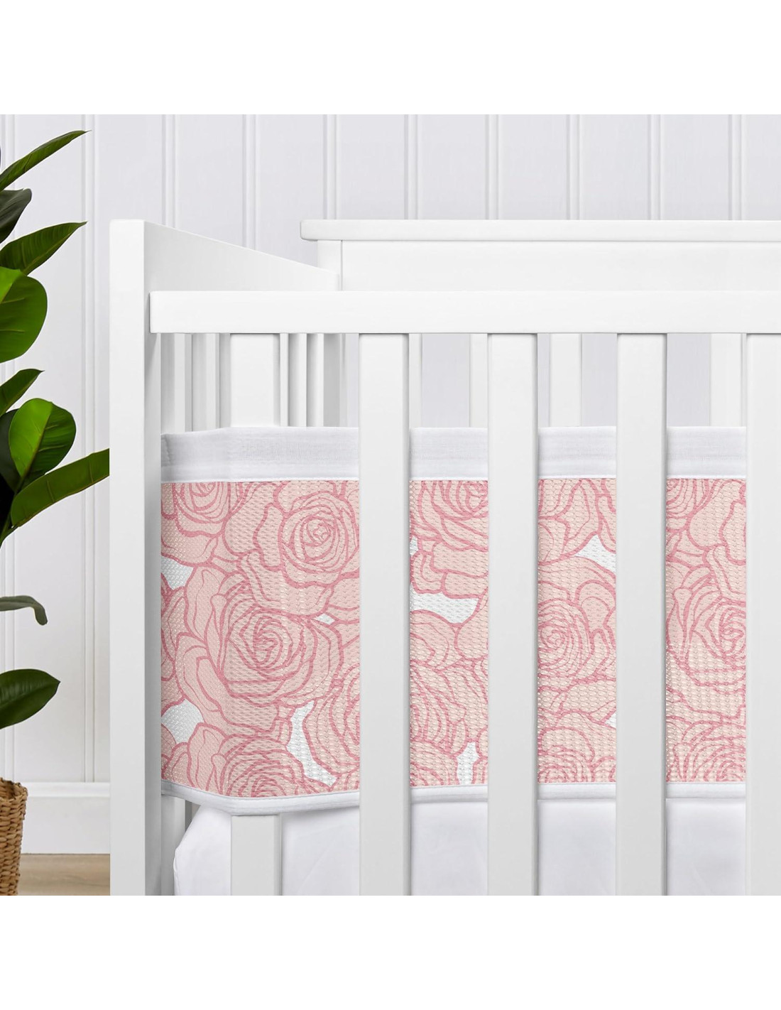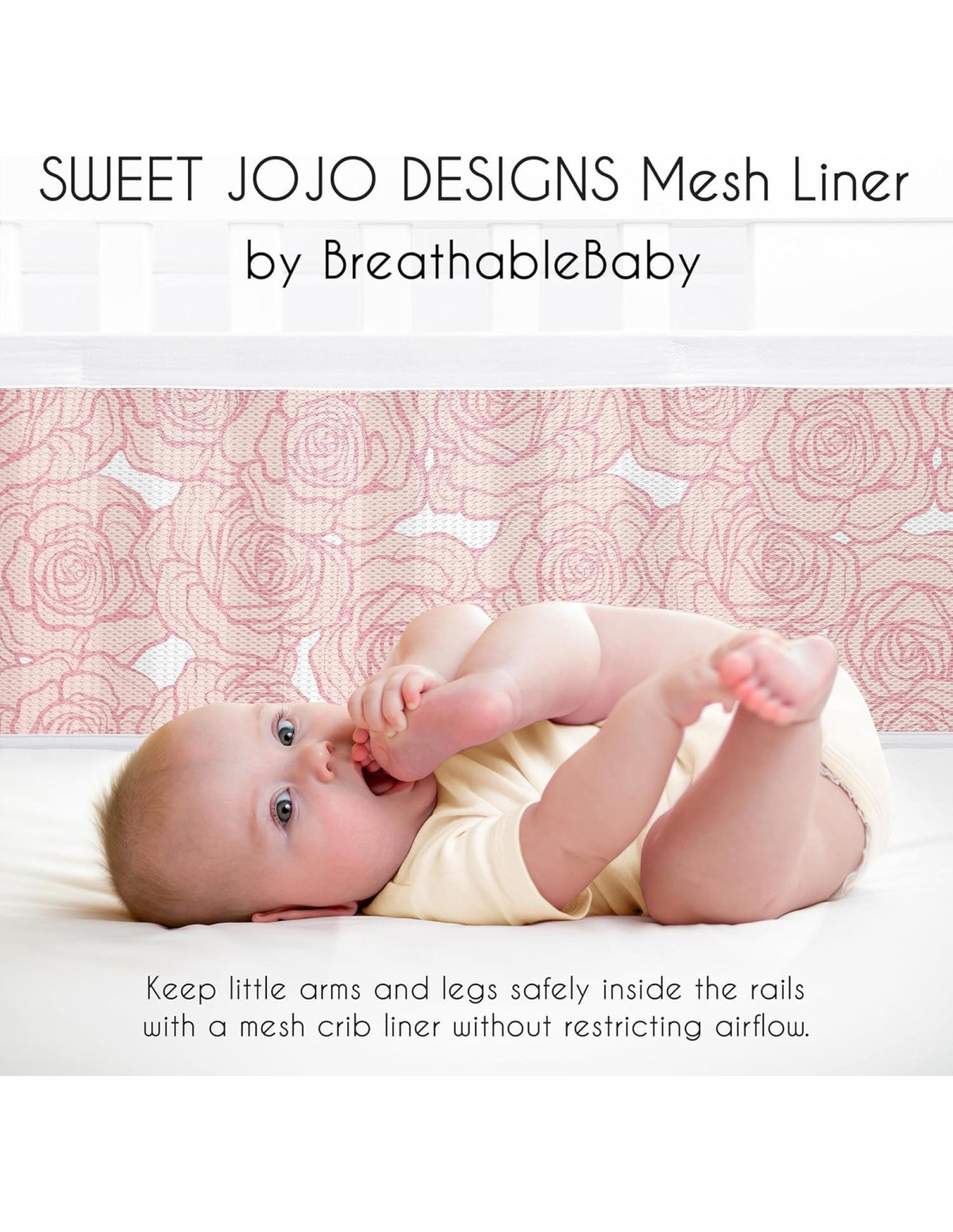 - Este forro de cuna de malla presenta un lujoso elegante diseño de princesa vintage boho shabby chic con un estampado de rosas de lujo con una paleta de colores complementaria de la colección de ropa de cama de rosas Sweet Jojo Designs de rosa claro y blanco.