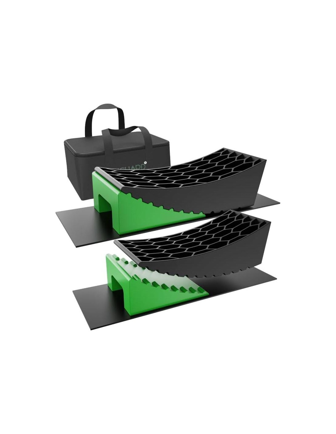 - Kit Completo de Niveladores para Camper: Viene con nivelador curvado negro *2, cuña verde *2, alfombrilla de agarre de goma negra *2 y una bolsa de almacenamiento de oxford. No más desorden con tablas apiladas. No más bloques de plástico agrietados. Todo se compacta y vuelve a la bolsa, haciéndolo agradable para ahorrar espacio.