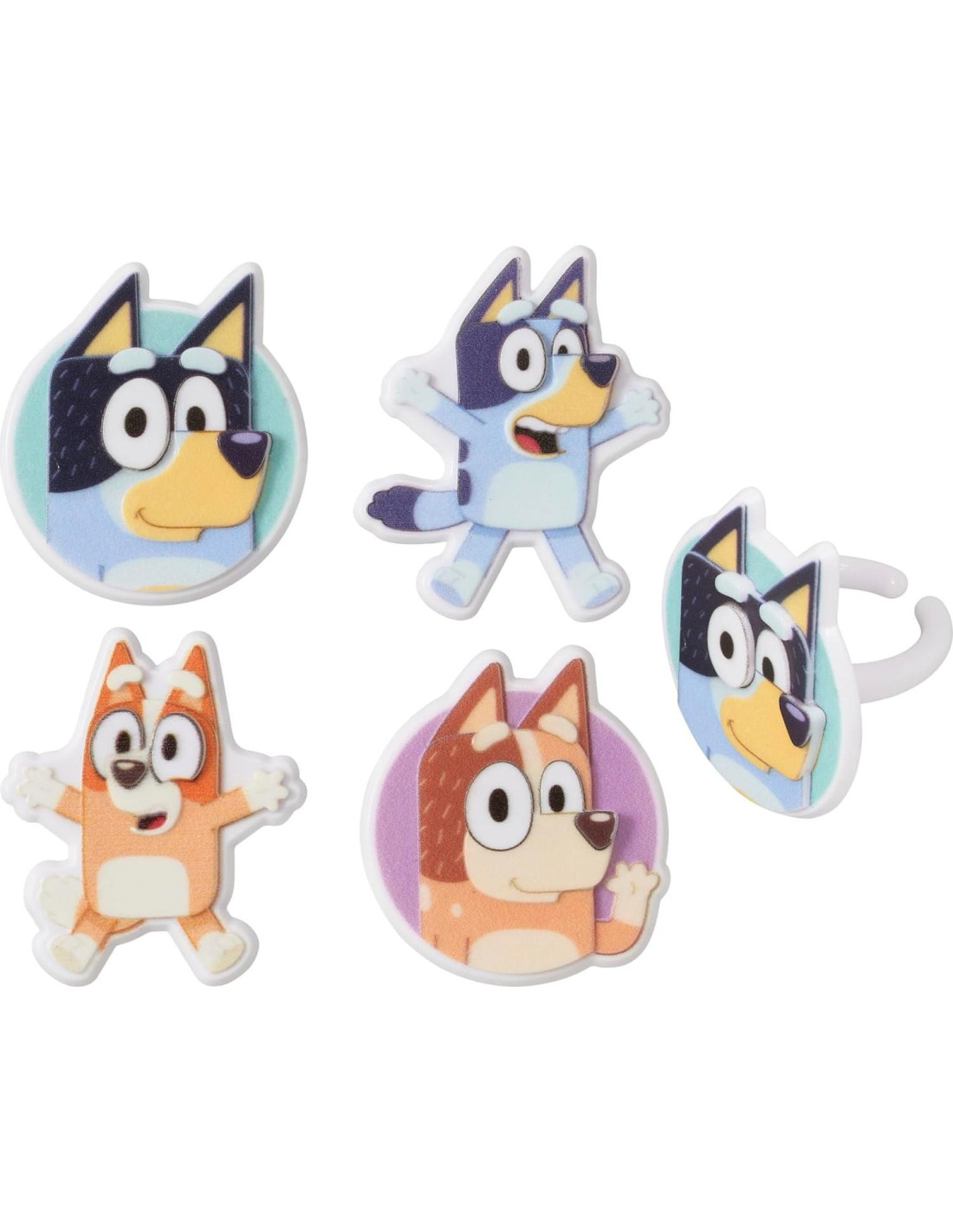 - DecoPac Bluey Anillos de Cupcake de Diversión - 72 adornos para cupcakes con los adorables cachorros Bluey y Bingo, junto a Bandit y Chilli, listos para celebraciones de cumpleaños. Lleva a Bluey a la mesa de postres con estos anillos para cupcakes y haz que tus dulces sean aún más especiales.