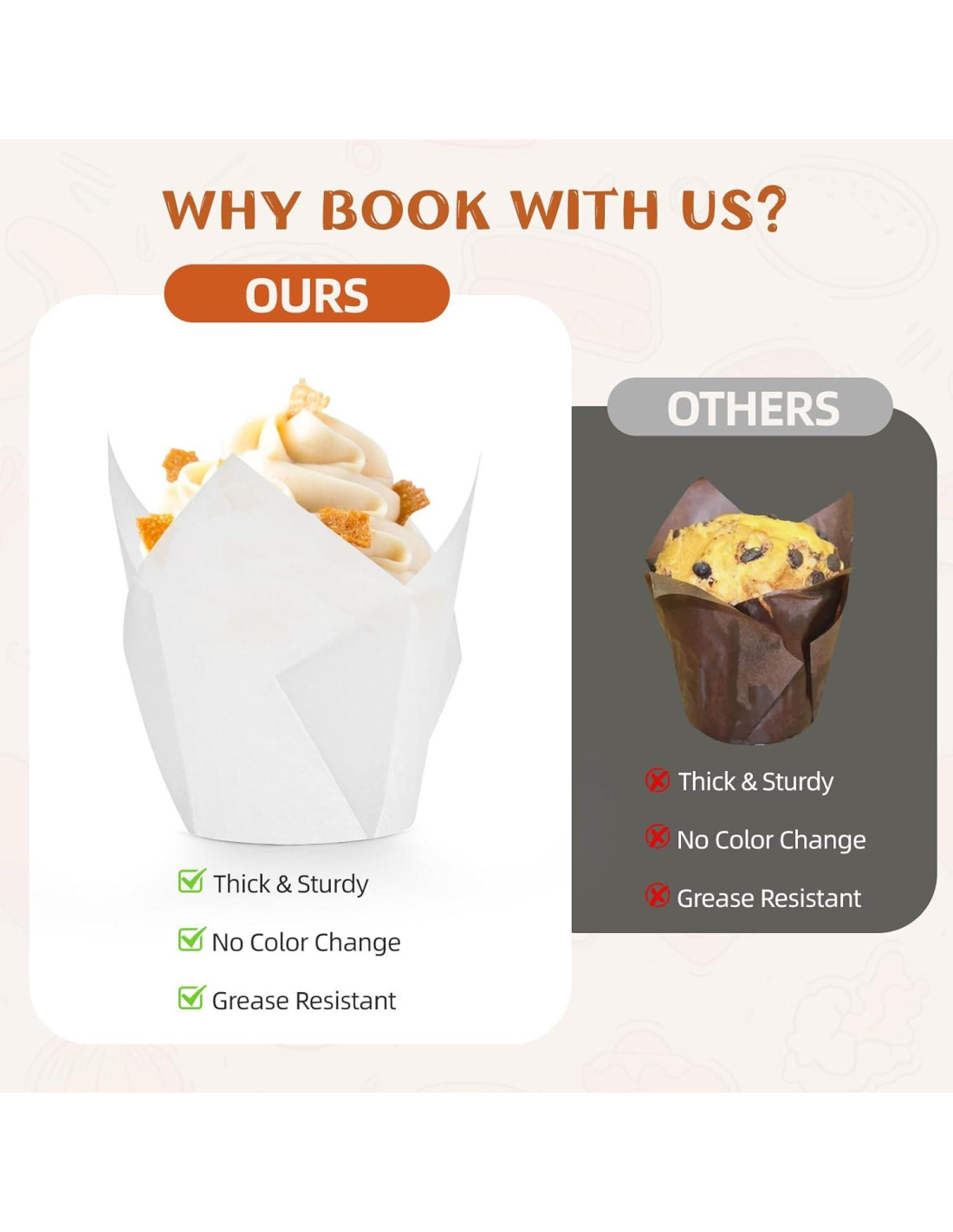 - PAQUETE DE VALOR: Recibirá 200 piezas de Forros de Cupcake Tulipanes en color Blanco. En comparación con los forros de horneado regulares, los Forros de Cupcake Tulipanes añaden un toque extra a sus cupcakes, mejorando el atractivo visual, haciendo que sus cupcakes se vean más elegantes, impresionantes y profesionales. Los envoltorios de cupcake JIRNGLA no solo son para hornear cupcakes o muffins, también para sostener caramelos, galletas, postres, frutas, etc.
