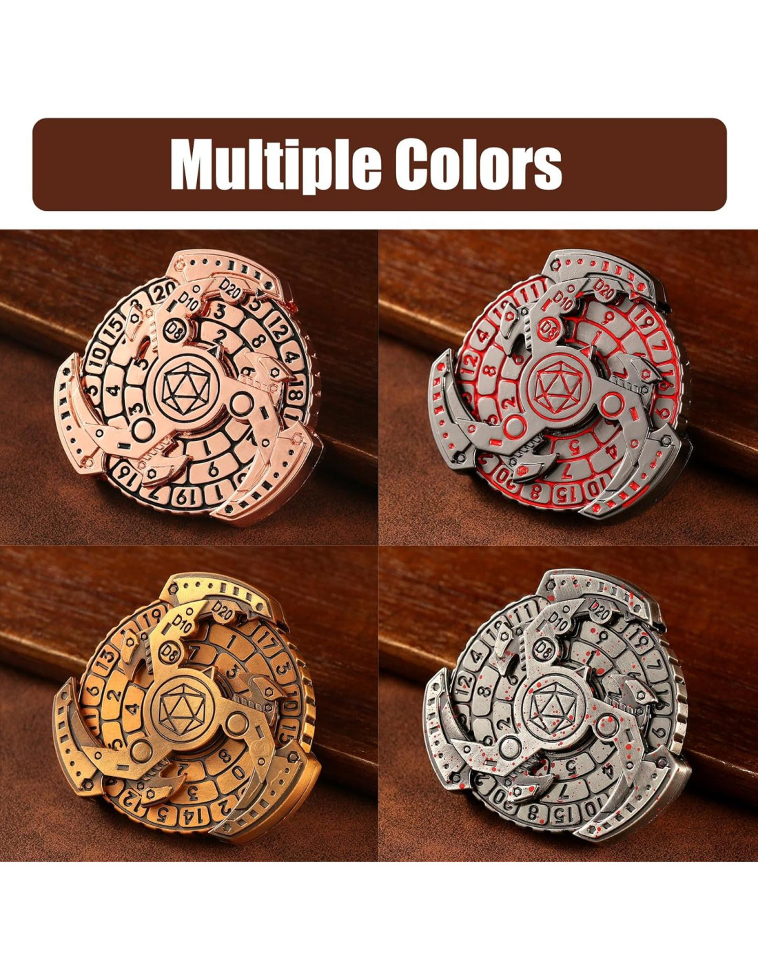 - Dados 7 en 1: Hay 6 conjuntos diferentes de números en ambos lados de la ruleta, un lado está grabado con D4, D6 y D12, y el otro lado está grabado con D8, D10 y D12.
