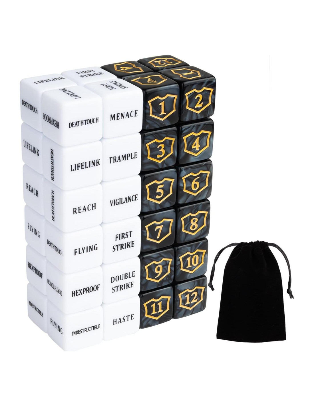 - Incluye: Total de 24 piezas de contadores de dados escudo (12 piezas de dados 1~6 y 12 piezas de dados 7~12) y 24 piezas de dados de palabras clave MTG (PRIMER ATAQUE, VIGILANCIA, AMENAZA, TRAMPLE, PRISA, DOBLE ATAQUE / VINCULO DE VIDA, ALCANCE, VUELO, HEXPROTECCIÓN, TOQUE MORTAL, INDESTRUCTIBLE) con bolsa de terciopelo.