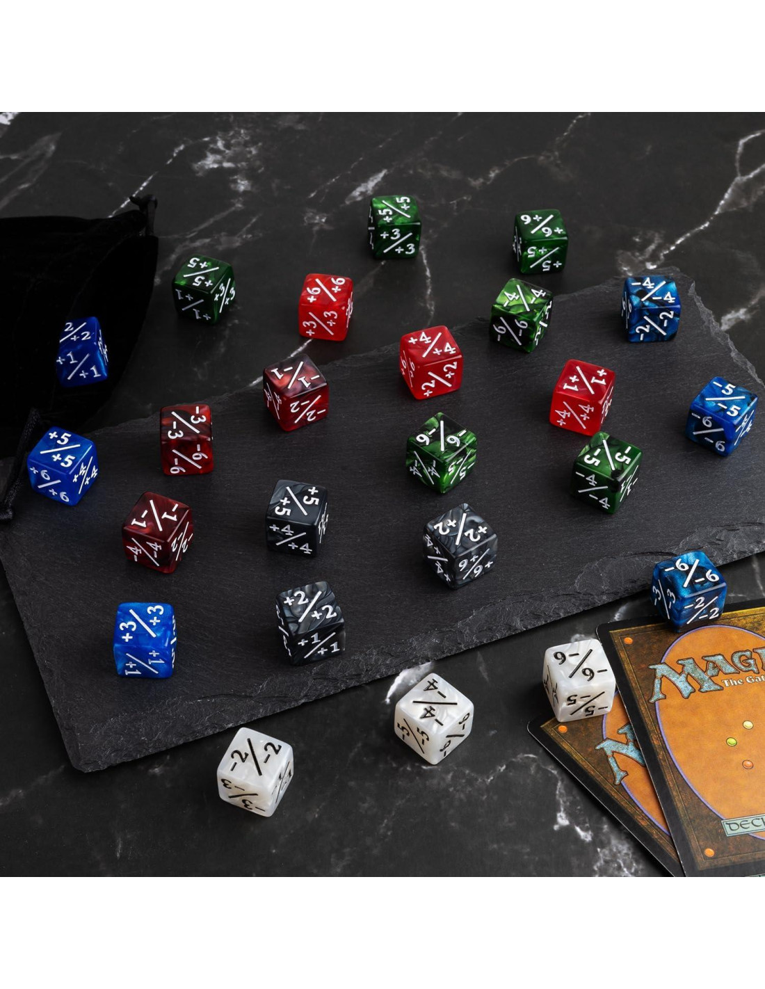 - Paquete Incluye: Total 51 pcs dados contadores mtg con bolsa de terciopelo. Incluye 24 pcs contadores +1~+6, 24 pcs contadores -1~-6. Hay 8 colores, como se muestra en la figura. Son dados D6 regulares de 0.63 pulgadas (16 mm). También hay 3 pcs dados d20 de 20mm.