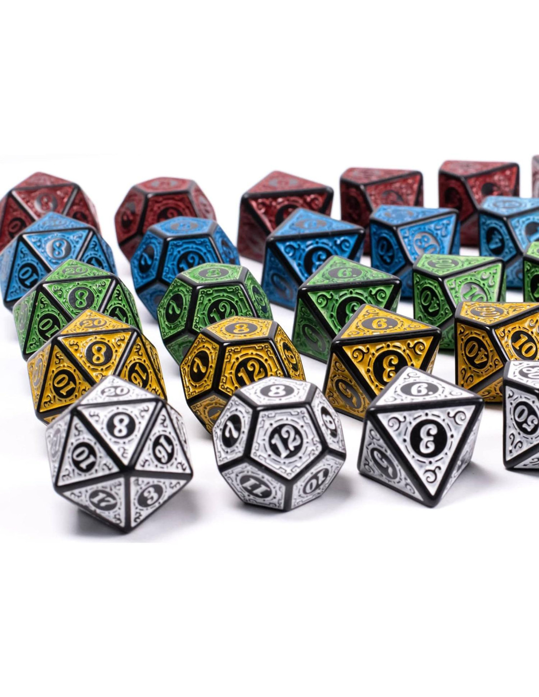 - 5 JUEGOS Y BOLSA DE DADOS: 5 juegos de dados de D&D, 35 piezas de dados en total. Un juego de dados totaliza 7 piezas incluyendo D4, D6, D8, D10, D12, D20 y D%, viene con un bolsillo de cuero con cordón para un fácil almacenamiento.