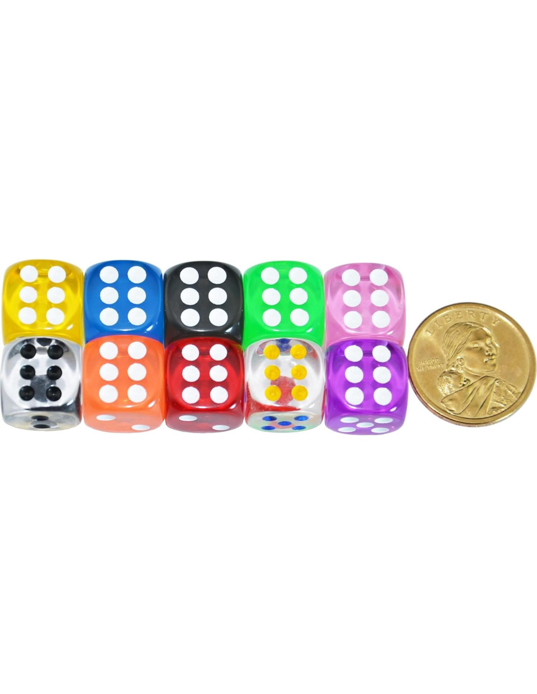 - Recibirás 10 dados transparentes de ángulo redondeado D6 de 16mm (5/8 pulgadas).