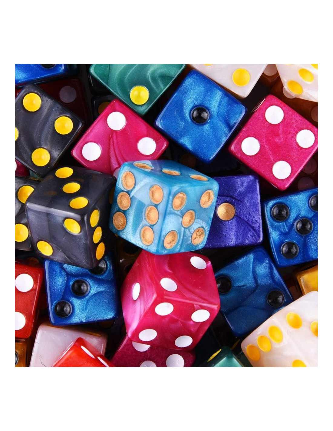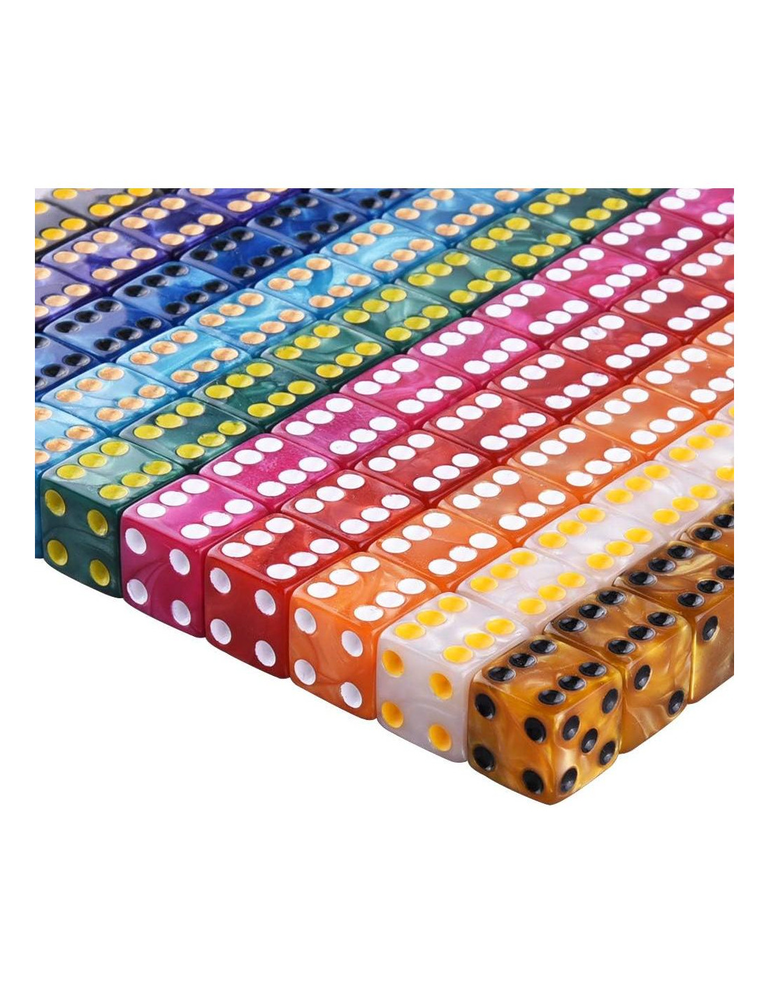 - Contiene 100 piezas de dados de 6 caras en 10 colores perla (cada color para 10 piezas)