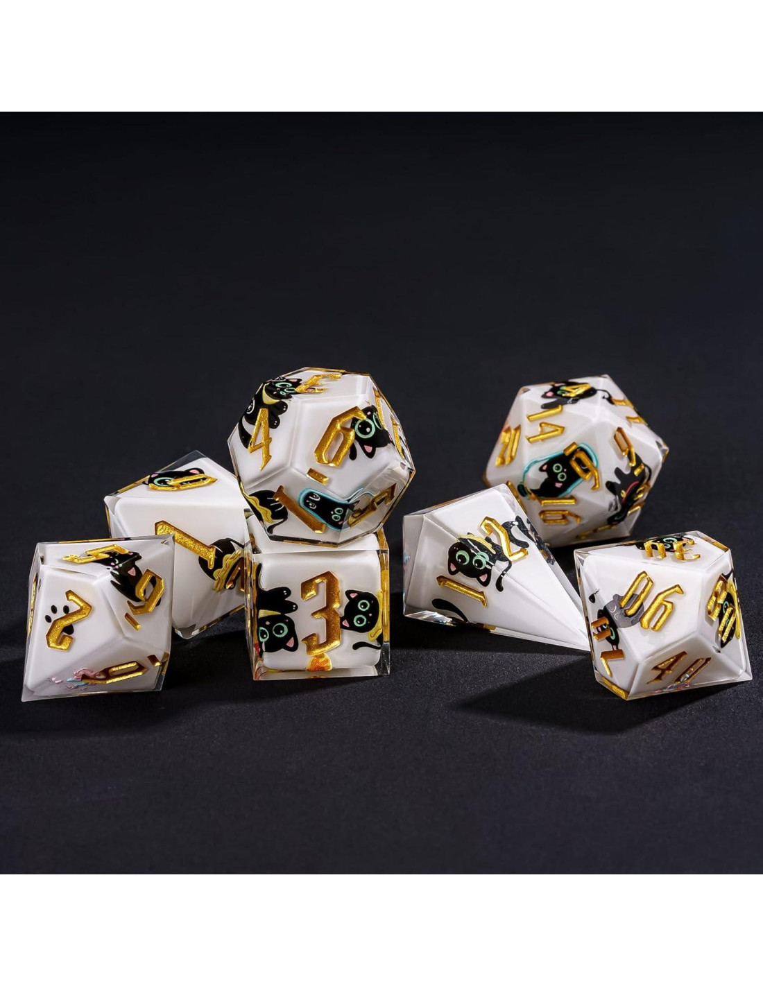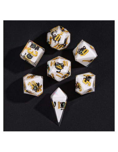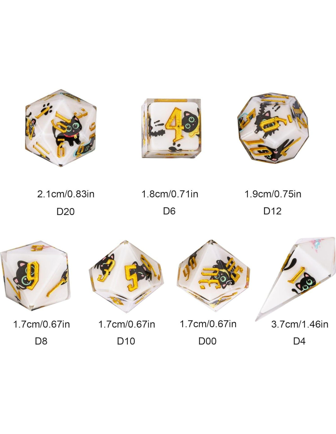 - Diseño Adorable: Cada dado en este conjunto de 7 piezas de resina presenta encantadoras pegatinas de gato negro dentro, añadiendo un toque caprichoso a tu experiencia de juego y haciéndolos perfectos para los amantes de los gatos.