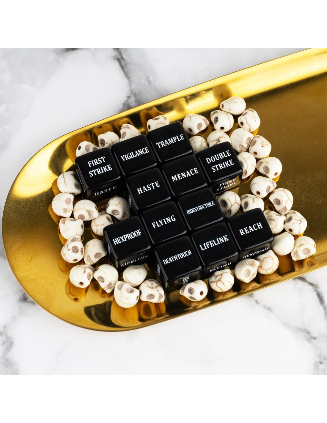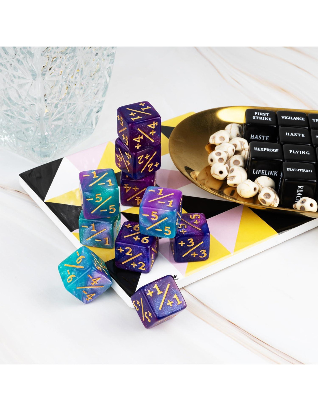 - Paquete incluye: Total 24 piezas de dados de palabras clave MTG negros (PRIMER ATAQUE, ATAQUE DOBLE, VIGILANCIA, AMENAZA, TRAMPLE, PRISA / VINCULO DE VIDA, ALCANCE, VUELO, HEXPROTECCIÓN, TOQUE MORTAL, INDESTRUCTIBLE) y 24 piezas de contadores de dados (12 piezas azules -1~-6 contadores y 12 piezas moradas +1~+6 contadores) con bolsa de terciopelo.