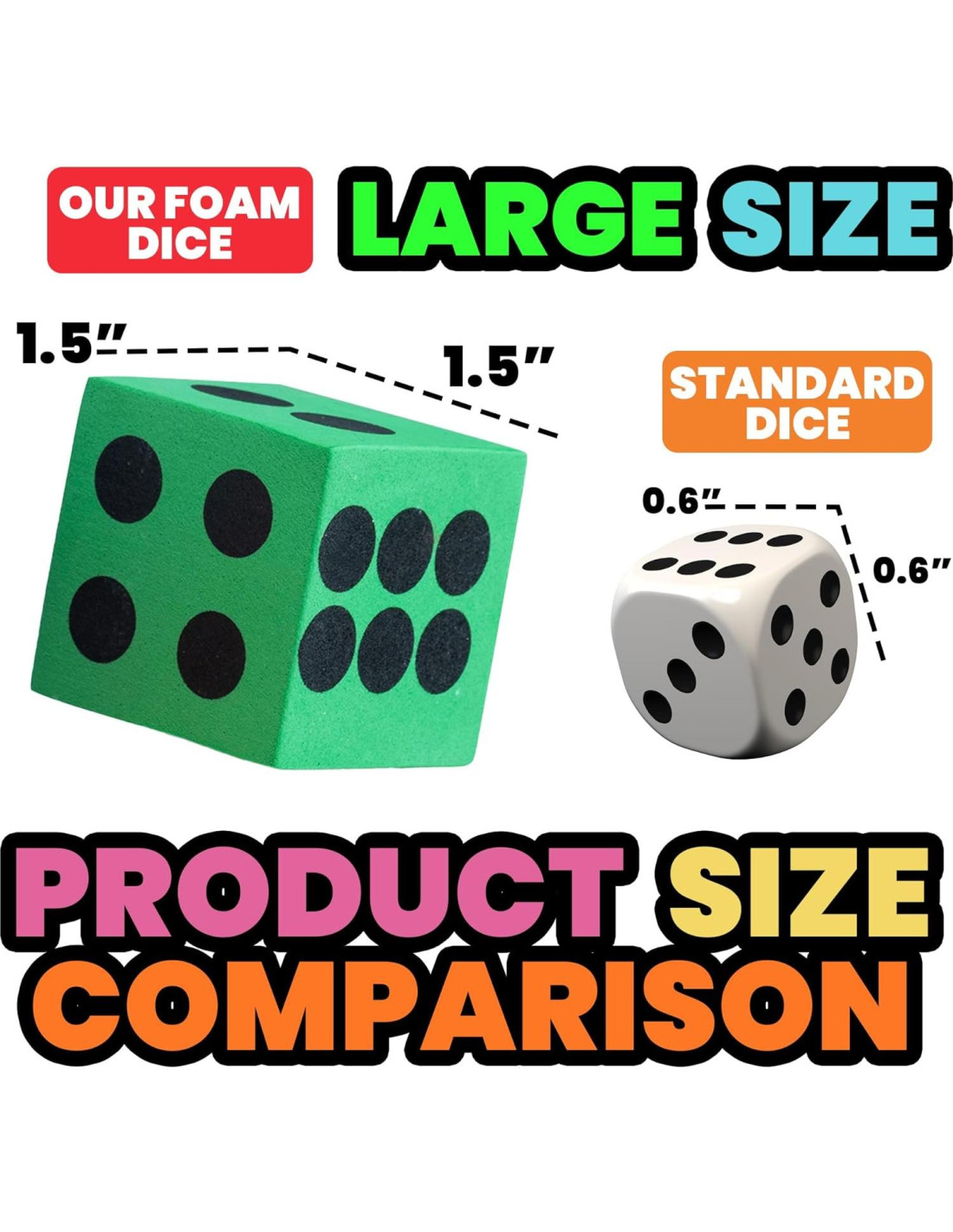 - PAQUETE A GRANEL DE 12 DADOS DE ESPUMA SOBREDIMENSIONADOS: Este paquete a granel de 12 dados de espuma es grande, colorido y divertido! Con cada pedido recibirás 12 dados de espuma de 3.81 cm. Incluye 6 colores diferentes; verde, naranja, azul, rojo, púrpura y rosa - 2 de cada color. Son maravillosos para muchas actividades y son más grandes que los dados regulares, ¡así que no se perderán ni rodarán fácilmente debajo de las cosas!