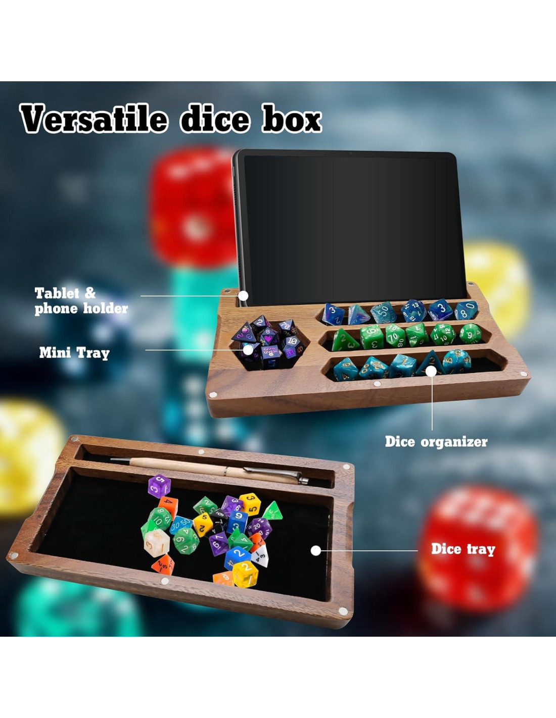 - Juego de Dos para Entusiastas: Incluye 2 cajas de dados de nogal, cada una con una bandeja para lanzar, ranuras de almacenamiento (dados no incluidos) y un soporte para teléfono, ofreciendo comodidad para varios RPG de mesa y juegos de mesa