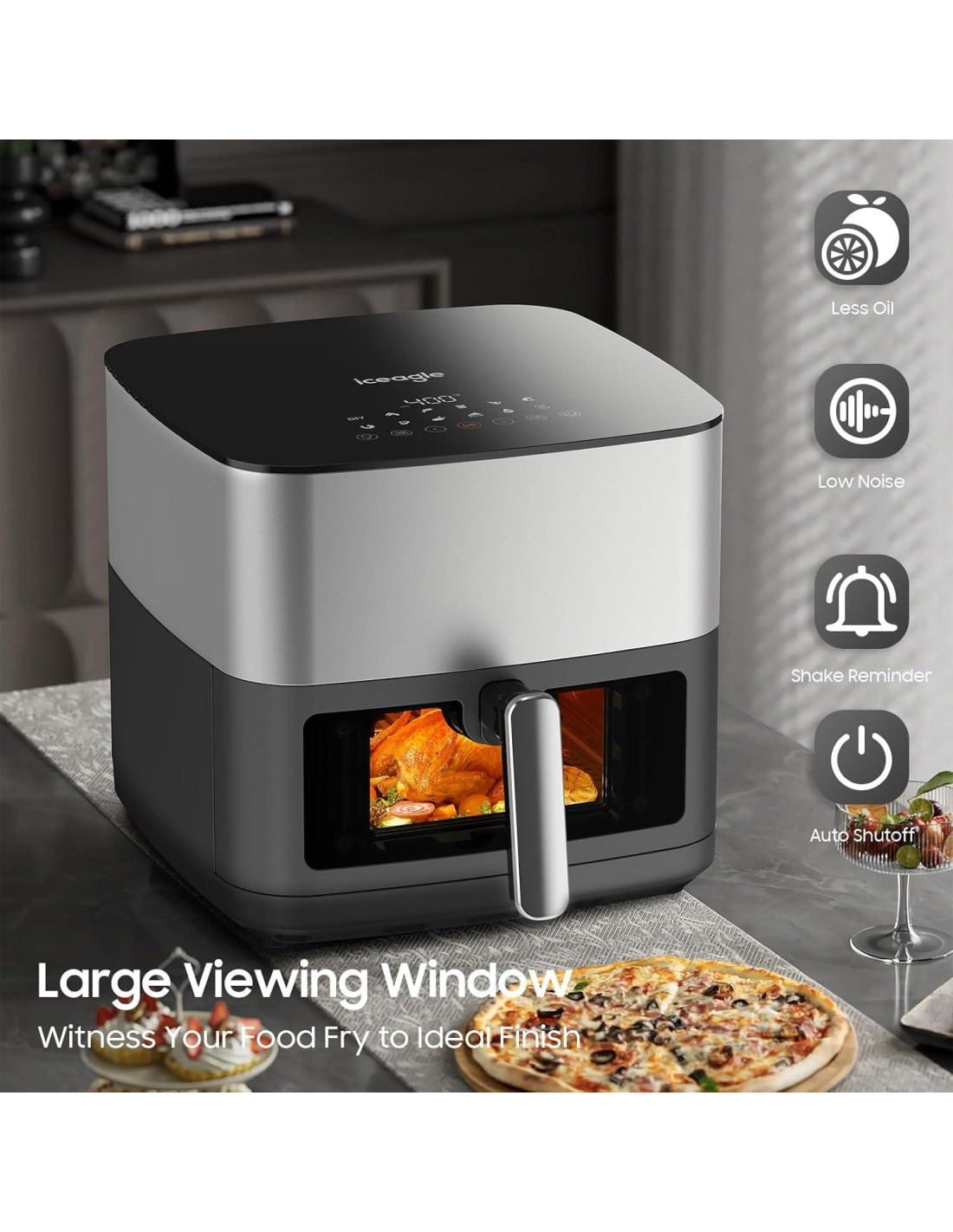 - Ventana Grande: ¡No más conjeturas con la freidora de aire Iceagle con ventana! La gran ventana le permite vigilar sus comidas sin interrumpir el proceso de cocción. Diga adiós a levantar la tapa constantemente y hola a una cocción sin complicaciones con esta freidora de aire