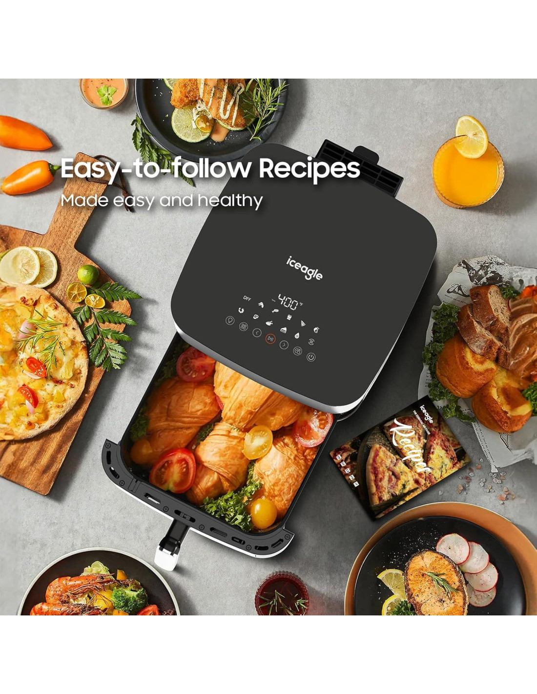 - Capacidad de 9 Cuartos para Grandes Comidas: Esta freidora de aire Iceagle está diseñada para servir a toda su familia con su generosa capacidad de 9 cuartos. Ideal para grandes reuniones o preparaciones de comidas, esta freidora de aire XXL puede manejarlo todo