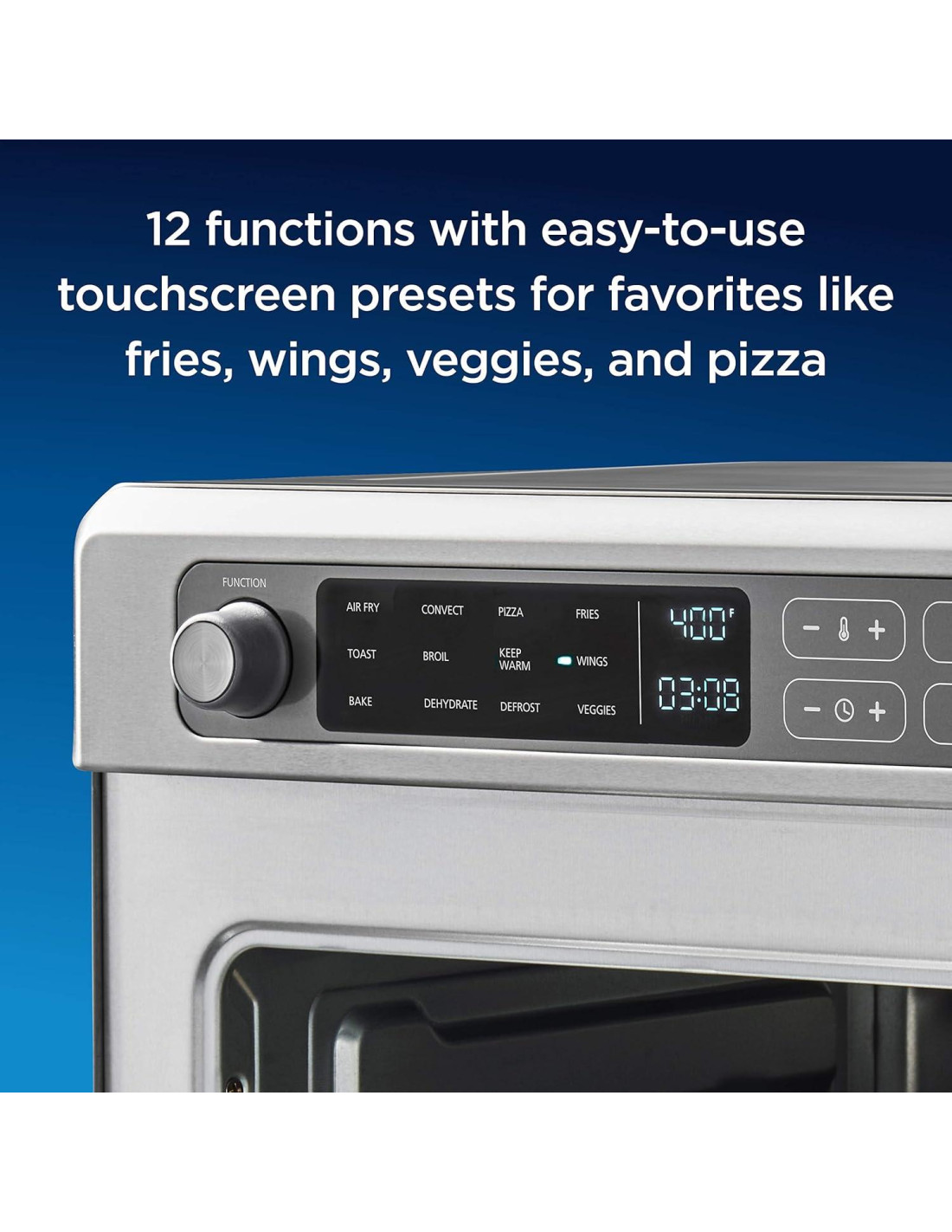 - AJUSTES DE UN TOQUE PARA TUS FAVORITOS: Los controles digitales táctiles premium incluyen ajustes para pizza, papas fritas, alitas y verduras; el horno proporciona control de temperatura de hasta 450F (232.22C)