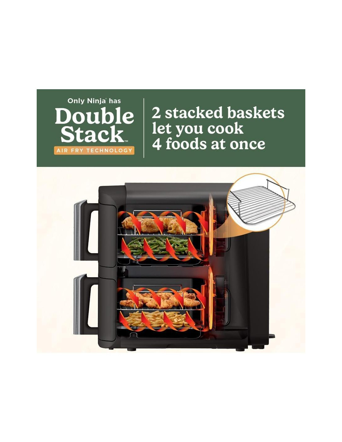 - TECNOLOGÍA DE FREÍR AL AIRE DOUBLESTACK: Solo el diseño apilado de Ninja tiene 2 cestas controladas de forma independiente para que puedas cocinar 4 alimentos a la vez.