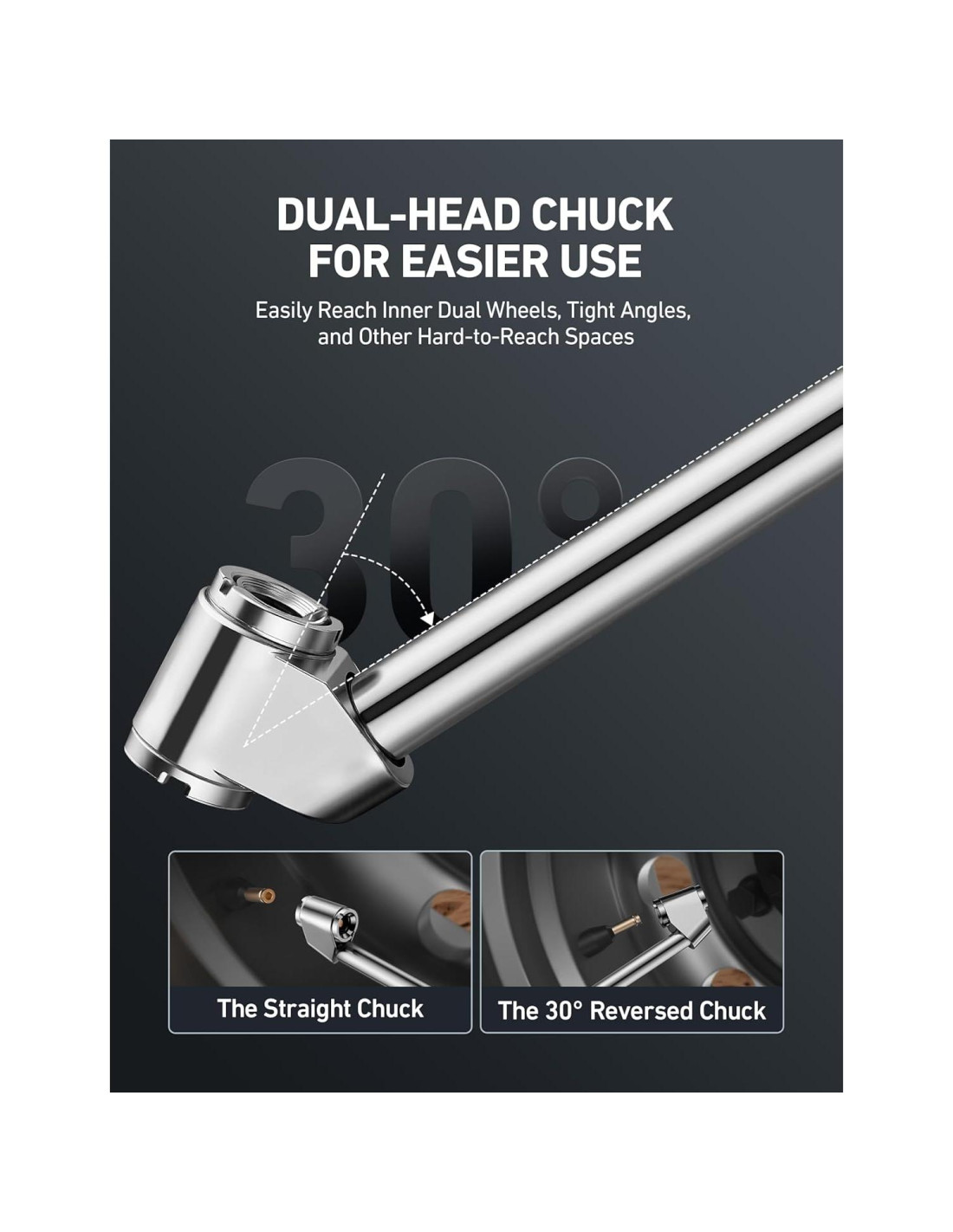 - CHUCK DE DOBLE CABEZA: El chuck recto y el chuck reverso de 30 están diseñados para acceder fácilmente a las ruedas duales internas y exteriores, ángulos ajustados y otros espacios de difícil acceso.