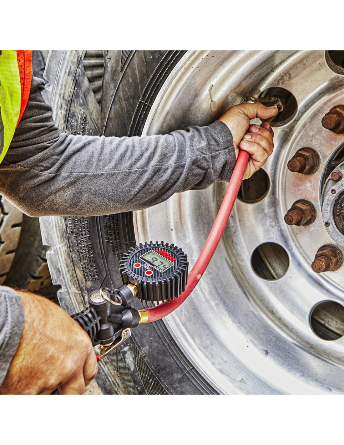 Optimiza la precisión de la presión de tus neumáticos con este manómetro inflador digital, fabricado con una pantalla LCD que mide en incrementos de 0.1 PSI y retroiluminada para una mejor lectura en entornos oscuros. Viene con una manguera de 15 pulgadas (38.1 cm) y un cabezal doble, para mayor accesibilidad con menos complicaciones. Nuestros manómetros digitales también cuentan con un manómetro giratorio de 360 grados (la cabeza gira para una lectura de medición fácil y cómoda) y una precisión de +/- 0.5 PSI en un rango de 0-255 PSI. Se enciende automáticamente cuando detecta presión e incluye una función de apagado automático después de 15 segundos que ahorra batería. Diseñado con un mango ergonómico y resistente, una funda de goma resistente a impactos y un botón de desinflado para evitar sobrepresiones en los neumáticos. Proporciona 4 unidades de medida: (PSI, Bar, kg/cm2, kPa), en comparación con las 2 unidades tradicionales de un manómetro analógico. Apariencia de cara de manómetro de fibra de carbono con una funda de goma protectora para proteger contra impactos. Mango de nylon moldeado para mayor comodidad con recubrimiento que es increíblemente duradero y ergonómico. Gatillo de inflador de acero con botón de desinflado de latón separado para un ajuste rápido en caso de que superes la presión objetivo. Conexiones de latón sólido en todo el dispositivo que proporcionan un rendimiento duradero, con una entrada de aire hembra NPT de 1/4" (se recomienda el conector Milton 727). CONTENIDO DEL PAQUETE: Manómetro Inflador Digital con mango de agarre cómodo y resistente, Manguera de goma de 15" (38.1 cm) Cabezal Doble + botón de desinflado, 2 baterías AAA (ya insertadas), Dimensiones del producto (sin manguera): 9.9 x 4.6 x 1.6 pulgadas (25.1 x 11.7 x 4.1 cm); 1.6 onzas (45.4 g), Manguera: 1/4" ID x 15" EPDM goma con conexiones de latón, Temperatura de funcionamiento: -4 a +140 grados F (-20 a +60 C), Entrada de aire: 1/4" NPT hembra (conector Milton 727 se vende por separado), Ensamblado en EE. UU., Garantía: 1 año. INSTRUCCIONES DE USO: Si usas un tipo de cabezal doble con un manómetro inflador y notas que el aire se escapa por el lado opuesto una vez conectado a la válvula Schrader del neumático, simplemente suelta el gatillo y retira el inflador de la válvula Schrader/neumático. Apunta el lado recto de la salida hacia arriba en el aire (asegúrate de que no esté apuntando a alguien). Aprieta el gatillo, permite que el aire fluya (la gravedad hará que la válvula de sellado caiga) y coloca el extremo del cabezal sobre la válvula Schrader/neumático mientras el aire aún fluye. El aire comenzará a fluir hacia el neumático.