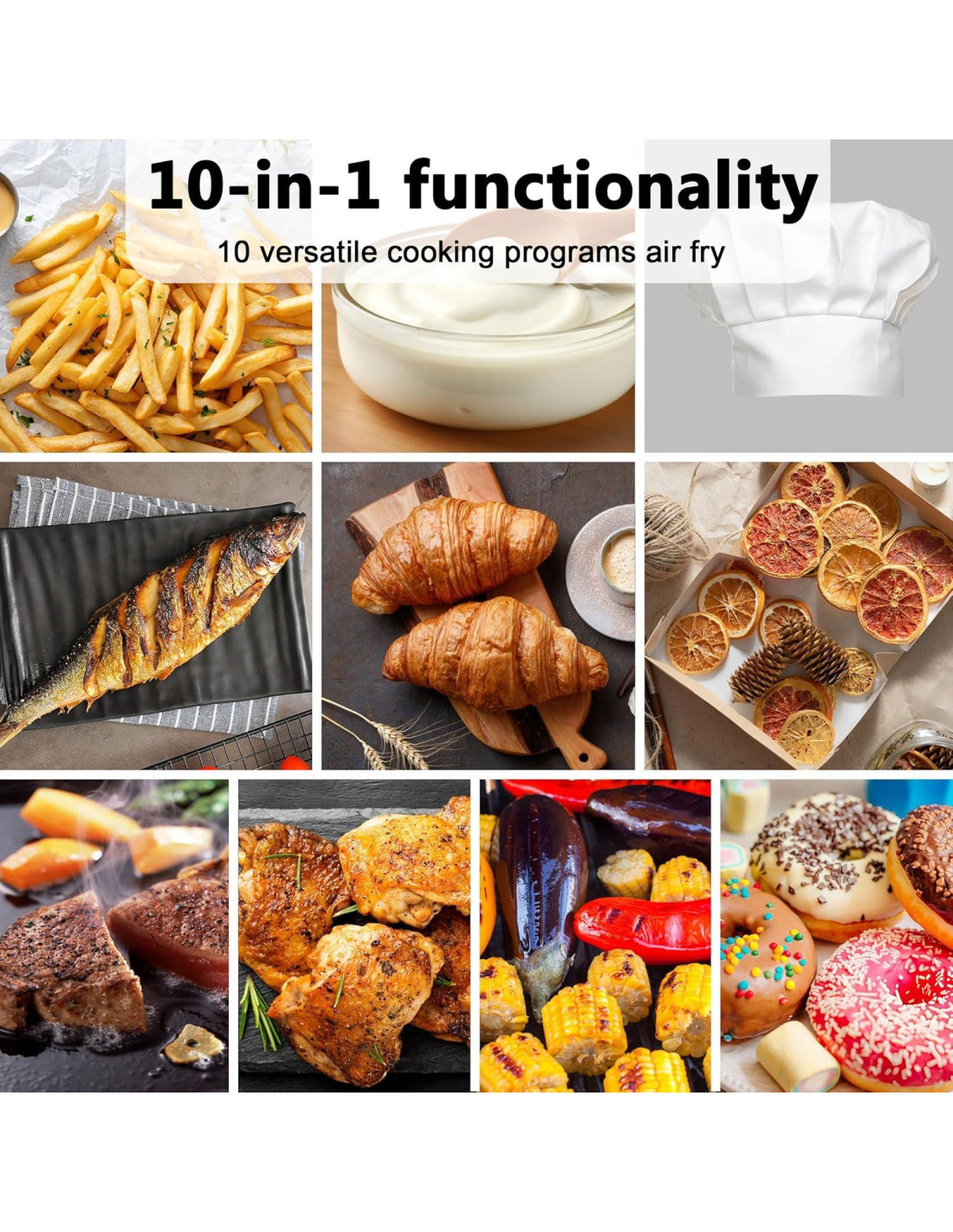 - Versatilidad 10 en 1: La freidora de aire tiene 10 menús preestablecidos: freír al aire, asar, deshidratar, hornear, asar, gratinar, recalentar, tostar, suave, personalizado. La tecnología de finalización sincronizada inteligente permite terminar 2 platos diferentes al mismo tiempo, asegurando que cada plato servido esté caliente y fresco con un tiempo de cocción mínimo.