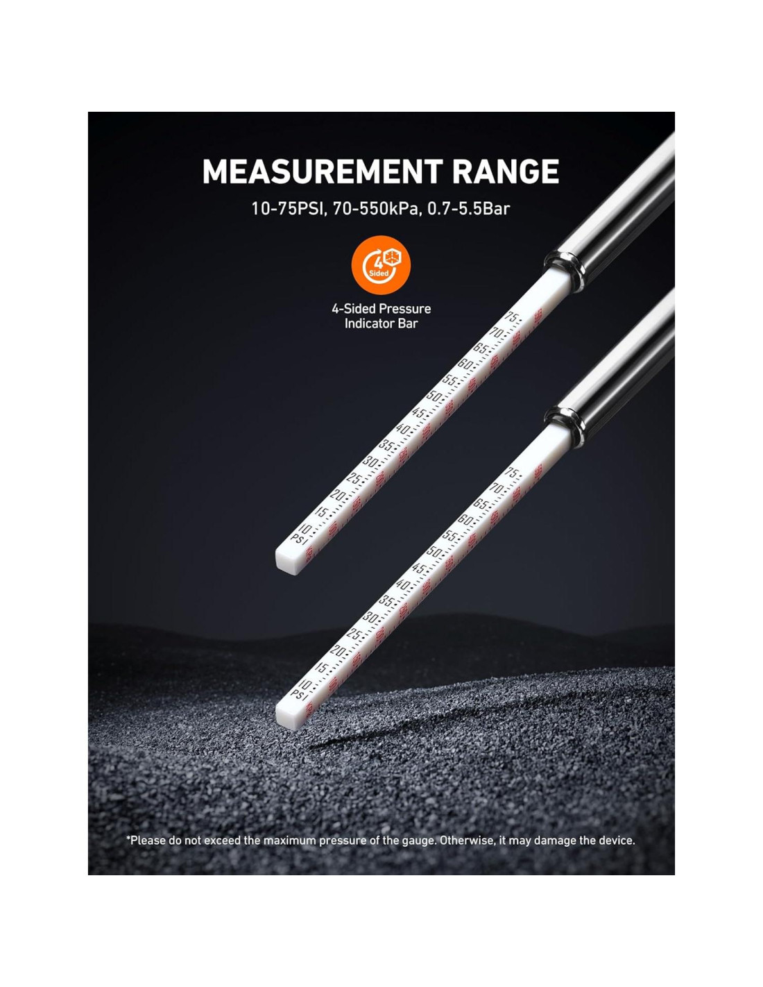 - 3 UNIDADES DISPONIBLES: Mide de 10-75PSI, 70-550kPa, y 0.7-5.5Bar. La barra indicadora de 4 lados está hecha de materiales ABS y proporciona lecturas claras. Ten en cuenta que exceder la presión máxima del medidor daña permanentemente el dispositivo.