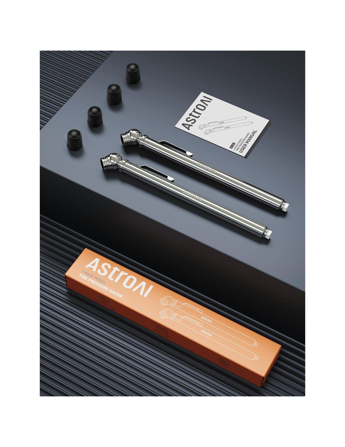 "Para Todas las Aventuras de la Vida" es más que un eslogan para nosotros. Es un estilo de vida y el núcleo de nuestra filosofía empresarial. AstroAI apoya al aventurero que llevas dentro y animamos a nuestros clientes a arriesgarse y superar los límites. Desarrollamos herramientas y productos que queremos y necesitamos para nuestras propias aventuras, luego salimos y los usamos para asegurarnos de que todos puedan disfrutar de nuestros productos. Hacemos nuestros productos para nosotros mismos, basados en necesidades y expectativas de la vida real. ¿Qué obtendrás al comprar el producto? Contiene 2 paquetes de medidores de presión de neumáticos tipo lápiz y 4 tapas de válvula. ¿Puede el rango de medición de 75 PSI satisfacer las necesidades de medición diarias? Sí, el rango de medición de 75 PSI puede satisfacer las necesidades de medición diarias de la mayoría de los escenarios, incluyendo varios tipos de sedanes, SUV, furgonetas, etc. Como un medidor de presión de neumáticos ligero y fácil de usar, es tu primera opción.