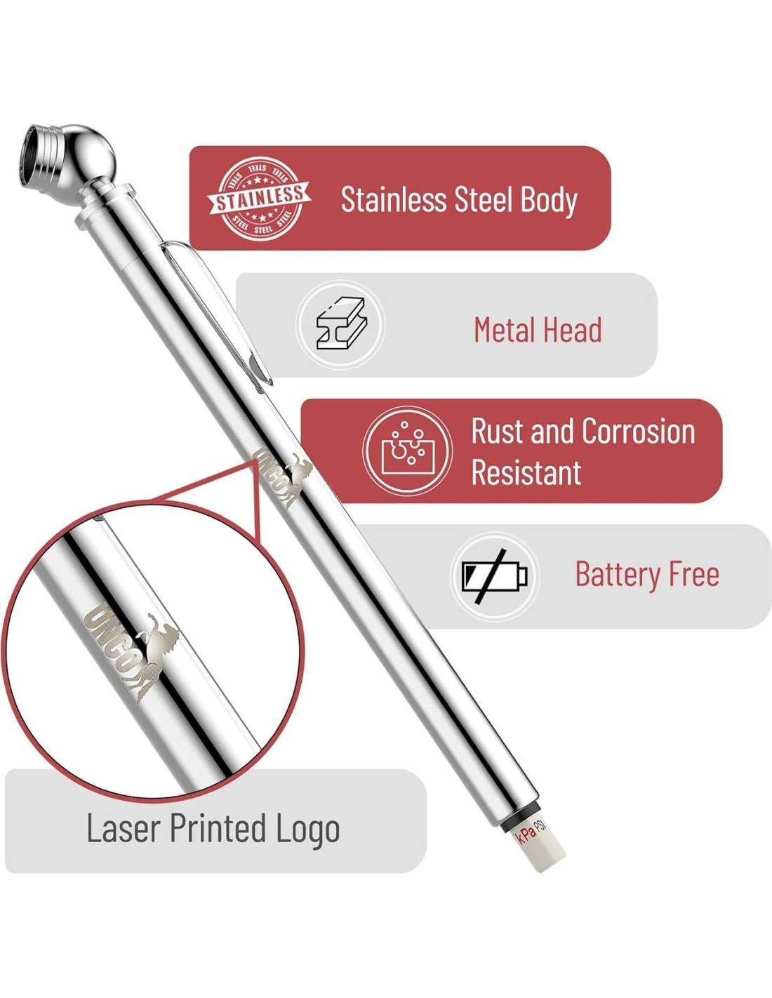 El paquete incluye 2 medidores de presión de neumáticos construidos con componentes de acero inoxidable de alta calidad, que son resistentes a la oxidación y a la corrosión para un sellado seguro alrededor de la válvula. Este dispositivo mide con precisión PSI, kPa, BAR en un rango de 10-75 PSI (0.69-5.17 BAR), 70-550 kPa y 0.7-5.5 BAR, respectivamente. Tenga en cuenta que no debe exceder la presión máxima del medidor, ya que lo dañará. El medidor de presión de neumáticos UNCO cuenta con una válvula desinfladora integrada, un conector y una barra indicadora de ABS que facilita su uso incluso en movimiento. Puede guardarlo cómodamente en su guantera o cinturón de herramientas sin ocupar demasiado espacio o peso. La operación sin batería de los medidores de presión de neumáticos garantiza una total fiabilidad bajo diferentes condiciones climáticas; una herramienta imprescindible para viajes por carretera y chequeos de seguridad. No solo es conveniente llevar este dispositivo con su clip para el bolsillo, sino que también requiere un mantenimiento mínimo para un rendimiento óptimo en todo momento.