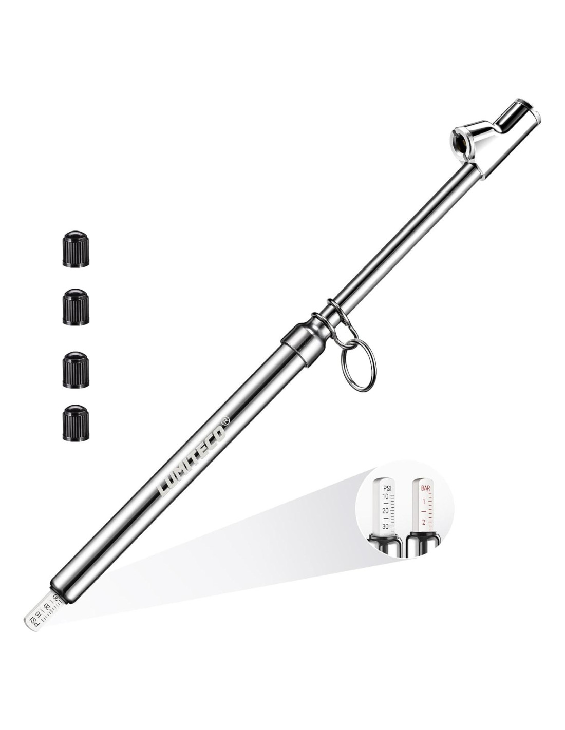- VARILLA DE AIRE EXTENDIDA CON ANILLO DE COLGAR El medidor de neumáticos de 12'' de longitud de aleación de zinc está construido con un núcleo de latón sólido y un cuerpo de acero cromado, también viene con un lazo de colgar para un fácil almacenamiento y 4 tapas de vástago de válvula adicionales para reemplazo, que es de alta resistencia y conveniente para un monitoreo preciso de la presión de los neumáticos a largo plazo.