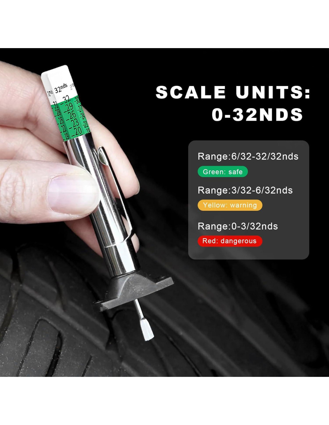 - Fácil de leer: Con escalas claras y colores brillantes, los propietarios de vehículos o mecánicos pueden leer rápida y precisamente la información para confirmar el estado de los neumáticos. El color verde (6/32-32/32) representa seguridad, el color amarillo (3/32-6/32) indica advertencia, y el color rojo (0-3/32) advierte de peligro.