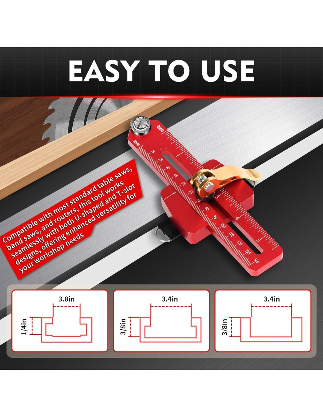 - FÁCIL DE USAR: Simplemente deslice la guía en la ranura T de su sierra de mesa y bloquéela frente a la hoja de la sierra. Se adapta a ranuras T de 3/8" x 3/4" (0,95 cm x 1,90 cm) y 1/4" x 3/4" (0,64 cm x 1,90 cm). Realice cortes de tiras delgadas de manera consistente con facilidad.