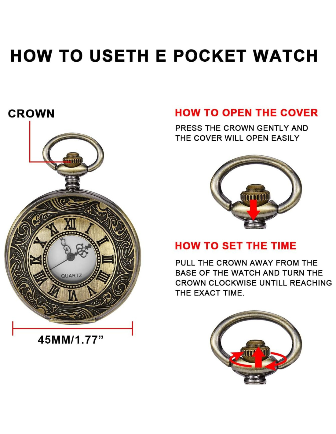 - Necesita batería: Este reloj de bolsillo está adoptado con el movimiento de cuarzo, que es preciso en el tiempo, ligero, de mantenimiento y uso conveniente.