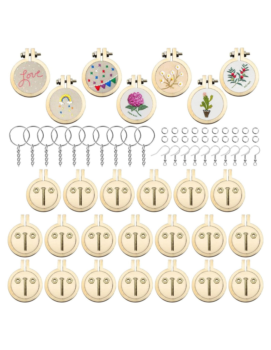- [EL PAQUETE INCLUYE] : --- Un total de 20 juegos de Aros de Madera Pequeños y 10 pcs llaveros, 10 pcs ganchos para pendientes, 20 pcs anillas. Cada aro está empaquetado individualmente y tiene 1 marco de madera + 2 chips de madera + 1 tornillo + 2 tuercas. Estos aros son solo para exhibir tus proyectos de bordado, no para uso de bordado.