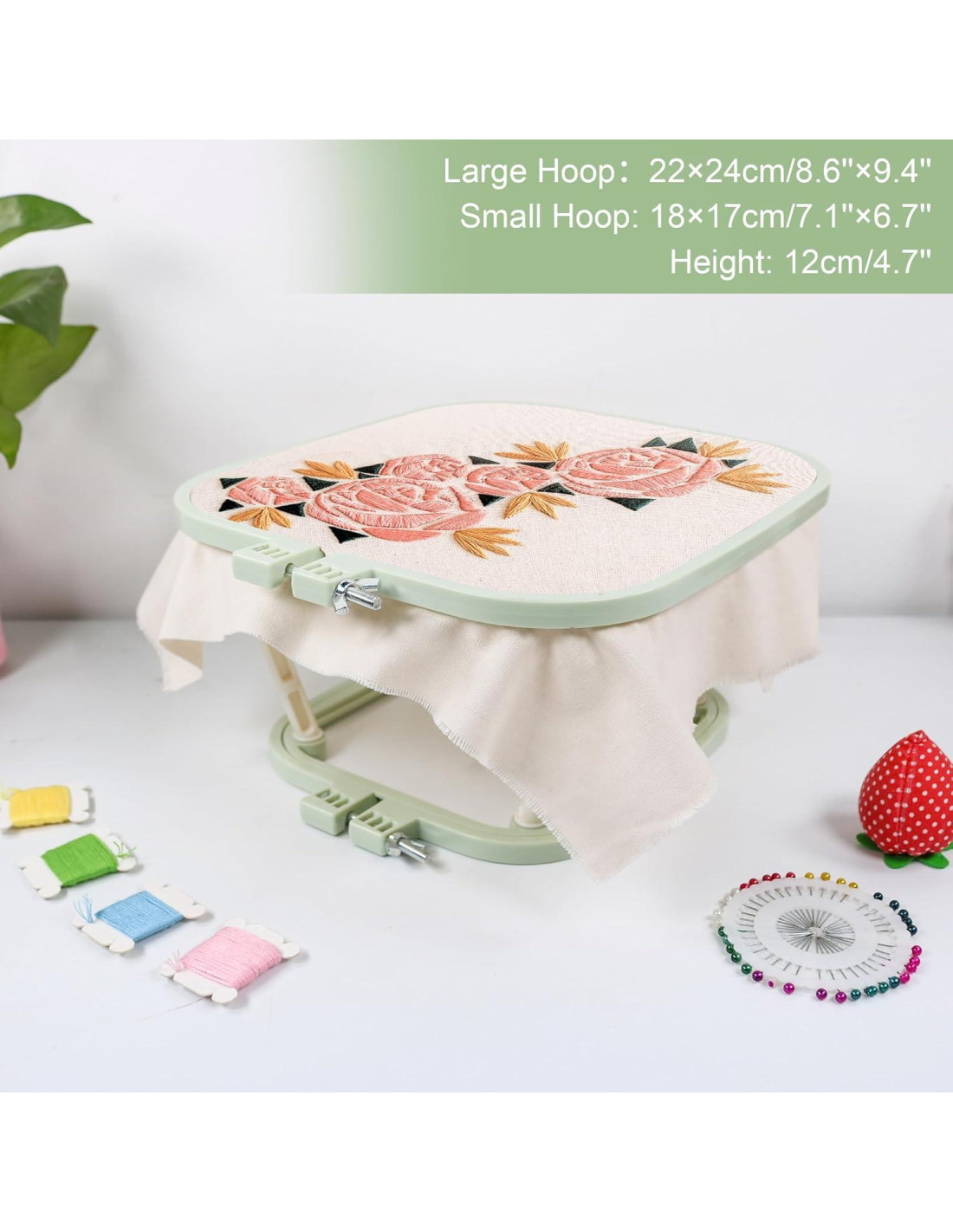- Diseño Único de Soporte de Marco: Nuestro soporte de marco de bordado consiste en 2 aros de bordado de plástico cuadrados de diferentes tamaños y 4 varillas de soporte, que forman un trapezio resistente. Así que puedes colocar este soporte en la mesa/sofá/escritorio/cama de manera segura para trabajar en tus proyectos de costura fácilmente.