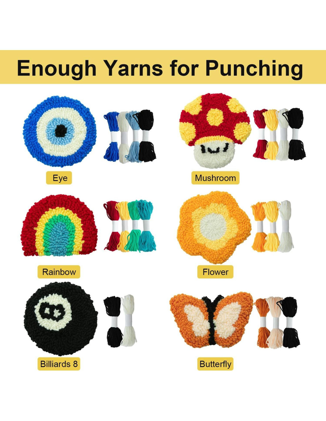 - [6 Patrones Hermosos] - El patrón estaba preimpreso en cada tela, lo que proporcionará gran ayuda a niños, principiantes, adultos, y los patrones marcados se pueden lavar después de que termines. Los patrones de los posavasos incluyen flor, ojo, arcoíris, mariposa, hongo, billar 8, y los hilos de colores brillantes te permiten disfrutar de la diversión de punch needle de una manera creativa.