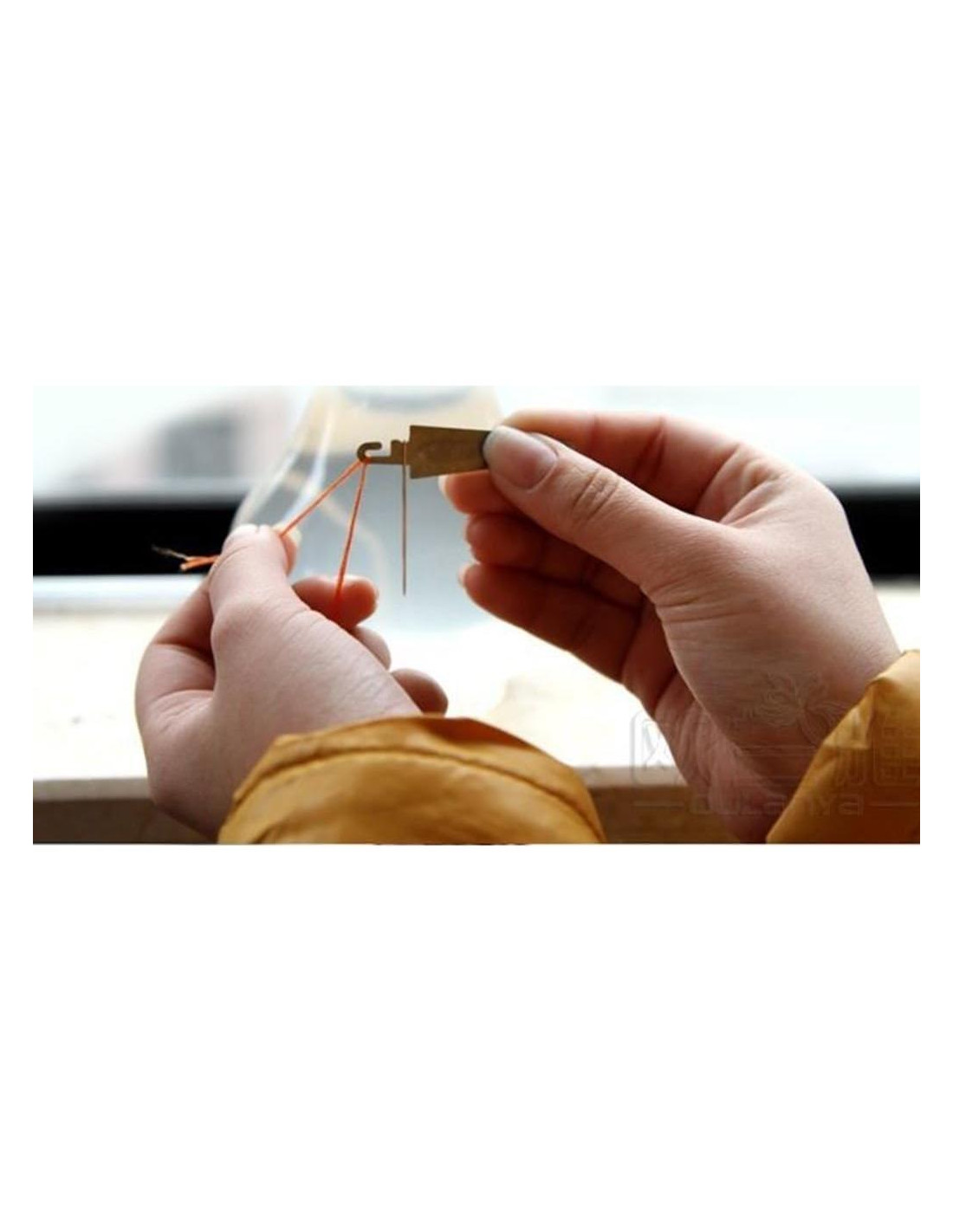 - Por favor, sigue las instrucciones como se muestra en la imagen: inserta el dispositivo a través de la aguja, enrolla el hilo en él y luego saca el hilo del agujero